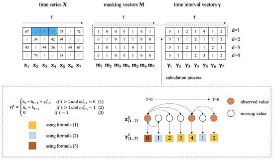 We introduce to denote the elapsed time since the most recent valid observation for a given feature. This variable serves to capture historical patterns of data absence, which can provide valuable contextual information for the downstream model. Let denote the timestamp at step t and the missing indicator of the d-th sensor at time t. The value of can then be formulated as