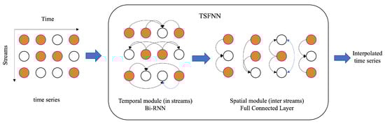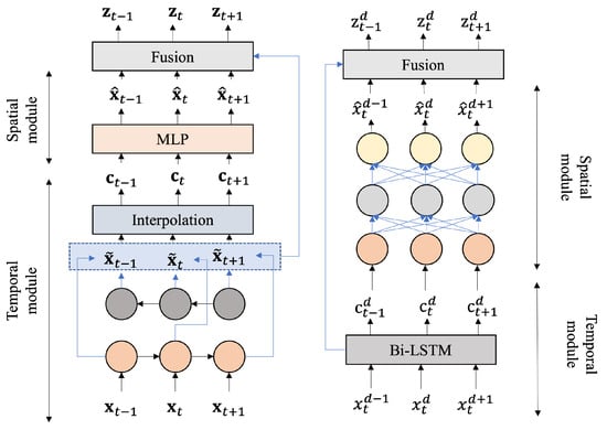 As shown in Figure 3, the TSFNN framework is composed of two main interpolation components: the Temporal Module and the Spatial Module. The temporal module aims to extract temporal patterns from the data streams of individual sensors, thereby modeling their dynamics over time. In contrast, the spatial module is responsible for capturing inter-sensor dependencies—especially among sensors operating in similar environments—and for refining the predictions produced by the temporal module. The detailed architecture of the proposed framework is presented in Figure 4.
