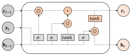 Architecture of LSTM unit. In the figure, represents hidden state, indicates data, stands for cell state, means sigmoid function, stands for tanh function, and ⊙ represents the element-wise multiplication.