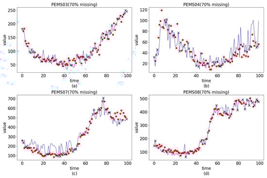 As shown in Table 1 and Table 2, the MEAN method consistently produce the lowest accuracy across all tested missing rates. This limitation arises from its simplistic strategy of interpolating by averaging the values immediately before and after the gap, which performs poorly when faced with long sequences of missing data or pronounced nonlinear patterns. In contrast, the two traditional machine learning approaches, KNN and MRF, achieved markedly better results. KNN identified the nearest neighbors of a missing point based on the Euclidean distance and imput its value using their mean, enabling more relevant reference points than the MEAN method, thus yielding higher accuracy. The MRF, on the other hand, estimated missing entries by iteratively building decision trees, focusing on modeling the dataset’s overall trend rather than depending solely on local information, which enhanced its interpolation effectiveness. The RNN adopted a unidirectional architecture to learn temporal information, which can better capture temporal features than previous methods and thus deduce the overall trend of the data. However, due to the temporal nature of the sequence, the information learned from one-way learning often could not cover the complete information of the data well, so there are certain limitations in its interpolation. Bi-RNN adopted a bidirectional RNN architecture to learn the temporal information of data from both positive and negative directions, striving to comprehensively capture temporal relationships. When the missing rate is relatively low, RNN-based methods may not be as effective as the previous machine learning algorithms. When the missing rate increases, the advantages of RNN methods become reflected. TIDER and DLinear relied on explicit decomposition of temporal components (e.g., trend and seasonality), which helped under regular patterns but limited their flexibility in complex traffic data. GRIN modeled bidirectional temporal and graph structures but was sensitive to high missing ratios due to accumulated errors. TimesNet captured periodicity effectively but lacked spatial modeling. Transformer performed moderately but suffered from disrupted attention when missing rates are high. TSFNN exhibited the best performance at different missing rates due to its combination of spatial features. We selected four datasets with 70% missing values to illustrate, as depicted in Figure 6. As shown in the figure, the filling curve of our method closely aligns with the true values, demonstrating the effectiveness of our model. The performance of these methods deteriorates as the missing rate increases. This is partly due to the remaining data becoming increasingly sparse and the need to extract fewer feature information.