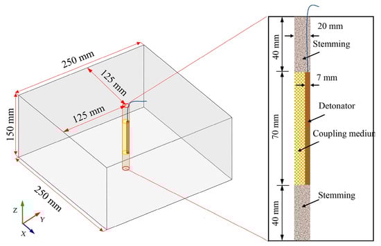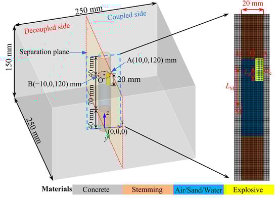 A numerical model was developed based on the geometry presented in Figure 3. In addition to the decoupling ratio K of 20/7 and three coupling media (air, sand, and water), six additional decoupling ratios (20/10, 20/9, 20/8, 20/6, 20/5, and 20/4) were introduced. The explosive position was also considered. The model was discretized into approximately 1.28 million hexahedral elements, with a mesh size of 2 mm × 2 mm × 2 mm for the rock and 0.5 mm × 0.5 mm × 2 mm for both the coupling media and the stemming. The explosive diameter was defined according to the decoupling ratio, and both the diameter and explosive position were adjusted using the parameters of the *INITIAL_VOLUME_FRACTION_GEOMETRY keyword. All other modeling settings were consistent with those described in Section 2.2. During the simulations, pressure histories at target points A (10, 0, 120) mm on the coupled side and B (−10, 0, 120) mm on the decoupled side were recorded to analyze the pressure attenuation characteristics in the rock under EDC blasting.