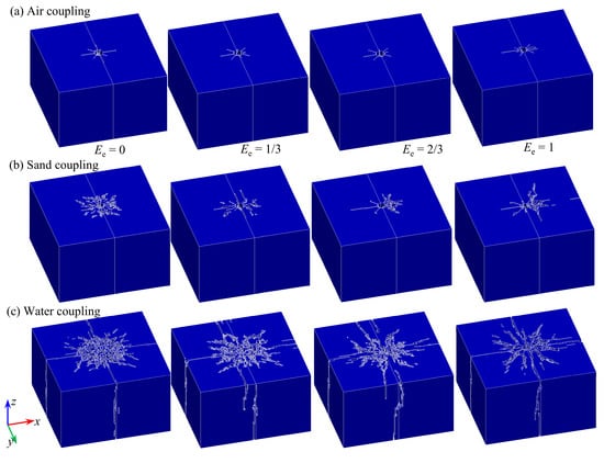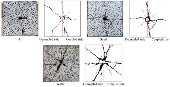 Figure 8 presents the damage patterns and associated fracture networks of the rock mass under EDC blasting conditions. Both the charge diameter and the type of coupling medium significantly influence the resulting damage pattern. Although radial cracks emanating from the blast center are observed under three coupling media, under air and sand coupling conditions, the fracture networks appear more sparse and asymmetric, with most cracks concentrated on the side closer to the explosive charge, as shown in Figure 8a,b. In contrast, water coupling generates a dense and intersecting fracture network on both the coupled and decoupled sides, due to its higher energy transfer efficiency, as shown in Figure 8c. Moreover, as the decoupling ratio increases, the extent of energy dissipation becomes more substantial, leading to a marked decrease in both the number and length of cracks observed on the specimen surface.