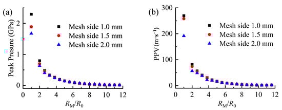 Comparisons of simulated peak pressures and PPV with different mesh sizes. (a) peak pressures; (b) PPV.