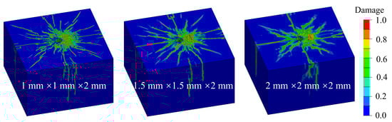 Using the aforementioned materials and finite element models, the crack patterns observed in physical tests of EDC blasting under different coupling media were successfully reproduced. To balance computational accuracy and efficiency, a mesh sensitivity analysis was carried out using the EDC blasting model with sand as the coupling medium to determine an appropriate mesh resolution. Three progressively refined mesh sizes (1 mm × 1 mm × 2 mm, 1.5 mm × 1.5 mm × 2 mm, and 2 mm × 2 mm × 2 mm) were selected based on existing recommendations [43,44], and their effects on peak pressure, PPV, and fracture network development were analyzed.