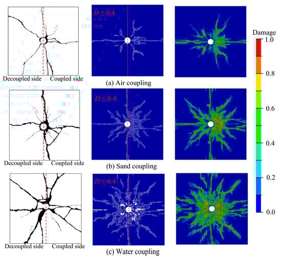 Comparison of test with simulated results: (a) air coupling; (b) sand coupling; (c) water coupling. Partially adapted from Xu, Y.Q.; Tao, M.; Liu, Y.L.; Hong, Z.X.; Wu, C.Q. Cracking behavior of brittle materials under eccentric decoupled charge blasting. Eng. Fail. Anal. 2024, 163, 108536, with permission from Elsevier, 2024 [11].