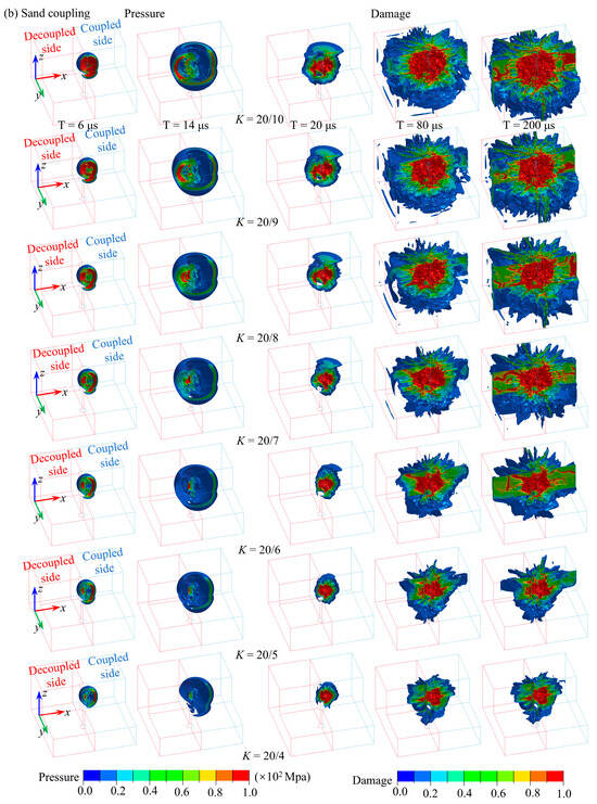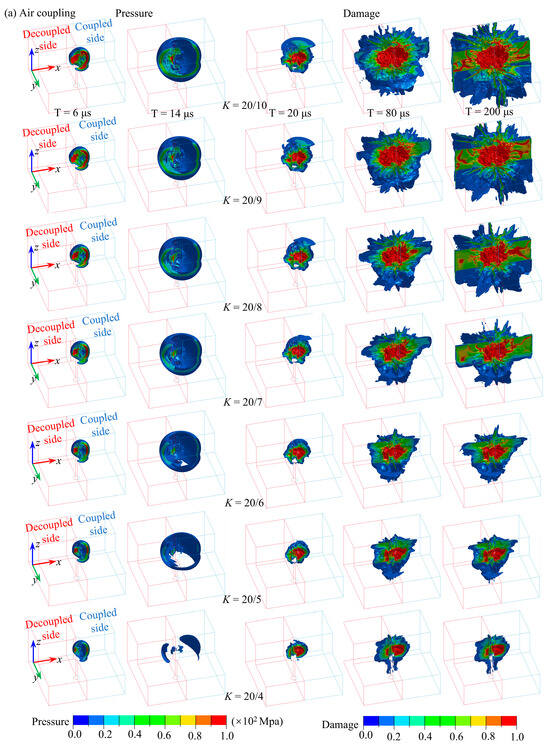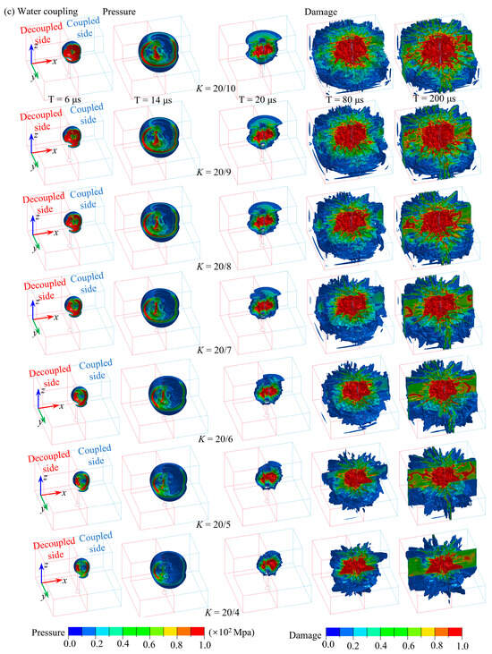 Following the calibration of the material model, numerical simulations were conducted to examine the EDC blasting process under various decoupling ratios and coupling media conditions. The corresponding patterns of pressure propagation and damage evolution are illustrated in Figure 7. After detonation, the explosive products rapidly expand and exert strong compression on the coupling medium within the borehole, generating a distinct high-pressure zone. At T = 6 μs, the coupled side exhibits a broader high-pressure zone under the minimum decoupling ratio (K = 20/10). Moreover, the type of coupling medium has a significant effect on pressure distribution. The water medium yields the widest high-pressure region, while the air medium produces the narrowest. As the pressure continues to propagate, the air and sand media exhibit notable asymmetry in the pressure field, leading to the emergence of a pressure eccentricity effect. In contrast, the water medium shows a more uniform distribution due to its lower compressibility. Under shock wave loading, the borehole wall rock initially undergoes compression and crushing, forming a crushed zone (0.8 ≤ D ≤ 1). As energy dissipates, the radial compressive stress becomes insufficient to cause additional failure, while the circumferential tensile stress remains above the rock’s tensile strength, promoting the extension of radial cracks from the edge of the crushed zone. In addition, wave reflection at the free surface generates radial tensile stresses that initiate circumferential cracks, ultimately producing a complete damage zone. The simulation results indicate that the final damage pattern differs significantly depending on the coupling medium. Under water coupling, the cracks are densely and uniformly distributed, with bilateral expansion of the damage zone. By contrast, under air or sand coupling, the damage zone is clearly biased toward the coupled side, while the decoupled side exhibits a more asymmetric damage pattern due to uneven pressure loading.