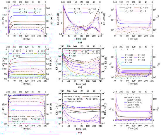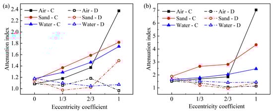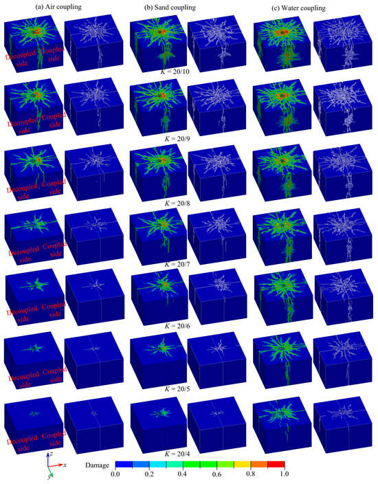 Under identical coupling media, increasing the decoupling ratio K from 20/10 to 20/4 led to a marked decrease in the volume ratios of all three damage regions. This reduction is primarily due to the decreased charge diameter and increased thickness of the coupling layer, which together enhance energy dissipation and reduce the intensity of the stress wave. Among the three media, water coupling consistently produced the largest damage volumes, followed by sand and then air, indicating that water provides the highest energy transmission efficiency and greatest rock-breaking capacity. Regarding the eccentricity effect, the values of δ in all damage zones increased with K under both air and sand coupling. Notably, at K = 20/4, δcru > 20 for both media, as the transmitted stress on the decoupled side was too weak to form a significant crushed zone, resulting in an extreme disparity. Additionally, δd > 1 across all K values for both air and sand coupling, confirming the consistent presence of a damage eccentricity effect. The decoupling ratio K = 20/5 was identified as the threshold where the dominance of the eccentricity effect transitions: below this value, air coupling exhibits a more pronounced effect; above it, sand coupling becomes more dominant, as shown in Figure 9c. In contrast, water coupling did not display a damage eccentricity effect when K < 20/8. The effect only emerged at larger decoupling ratios, suggesting that eccentric damage under water coupling conditions requires high levels of decoupling. At lower K values, most of the explosive energy on the coupled side is consumed in forming the crushed zone, while the decoupled side experiences primarily crack initiation and extension. As K increases, the energy on the coupled side becomes increasingly directed toward crack development and eventually exceeds that on the decoupled side, leading to the onset of the eccentricity effect.