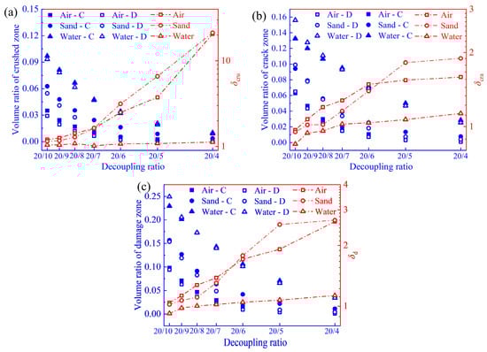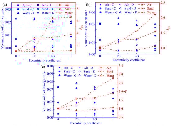 To quantitatively assess the extent of blast-induced rock damage and the asymmetry in the fracture pattern, the volume ratios of the crushed zone (Vcru/Vr), crack zone (Vcra/Vr), and total damage zone (Vd/Vr) around the borehole were calculated. As shown in Figure 9, the damage zone includes both the crushed and cracked zones [47]. Additionally, the fracture eccentricity δ was defined as the volume ratio between the coupled side and the decoupled side for each damage region. Specifically, δcru, δcra, and δd represent the eccentricity of the crushed zone, crack zone, and total damage zone, respectively. A value of δ > 1 indicates that the damage is concentrated on the coupled side, reflecting the presence of a damage eccentricity effect.