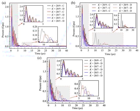 To further investigate the pressure propagation behavior within the rock under EDC conditions, pressure–time histories at target points A and B were plotted for decoupling ratios K = 20/9, 20/7, and 20/5, as shown in Figure 10. On the coupled side, the borehole wall is first subjected to the incident shock wave, resulting in a rapid rise to peak pressure followed by sharp attenuation. This behavior is primarily influenced by the energy absorption of the crushed zone. Multiple stress wave reflections at the borehole interface generate secondary local peaks, thereby extending the duration of pressure loading.