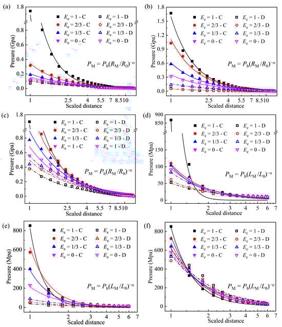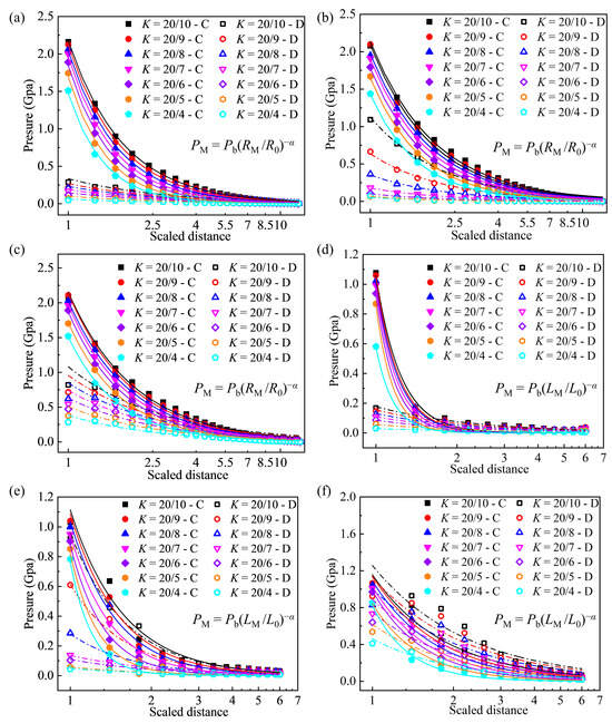 According to the numerical simulation results of EDC blasting, a clear distinction in peak pressure attenuation behavior was observed between the coupled and decoupled sides. To quantitatively describe the attenuation of peak borehole wall pressure along the radial and axial directions of the unloaded section, a power function was used to fit the peak pressure data under various EDC configurations [25,37,48,49]. The fitting results are presented in Figure 11 and Table 7.