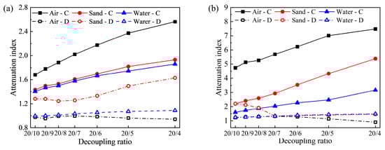 Relationship between peak pressure and distance under different decoupling ratios: (a) air coupling—radial; (b) sand coupling—radial; (c) water coupling—radial; (d) air coupling—axial; (e) sand coupling—axial; (f) water coupling—axial. C represents the coupled side, and D represents the decoupled side.