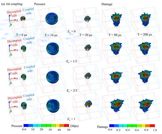 On the decoupled side, the pressure rise is significantly delayed compared with the coupled side, and the delay increases with larger decoupling ratios. This is attributed to the thickening of the coupling medium layer, which increases the travel path of the stress wave, reduces its propagation speed, and delays the arrival time. As a result, both the peak pressure and loading rate decrease markedly. Among the three media, air exhibits the lowest peak pressure, the most pronounced delay, and the least energy transfer efficiency. The pressure difference between the coupled and decoupled sides is greatest under air coupling, leading to an apparent asymmetry in the resulting damage, as shown in Figure 10a. By contrast, water coupling exhibits the highest peak pressure, fastest propagation speed, and shortest arrival time. The smallest pressure difference between the two sides is observed in this case, suggesting a more uniform pressure distribution, as shown in Figure 10c. This facilitates the development of a coherent and evenly distributed crack network, enhancing overall crushing efficiency. Moreover, the pressure duration on the decoupled side increases in the order: air < sand < water. Liu et al. [20] attributed this trend to differences in wave reflection frequency and attenuation characteristics at the borehole wall. The degree of stress wave attenuation is closely related to the porosity of the coupling medium—higher porosity in air leads to greater attenuation. Regardless of the medium, increasing the decoupling ratio reduces the charge diameter and total explosive energy, which in turn lowers the peak pressures on both sides of the borehole and shortens the overall pressure duration.