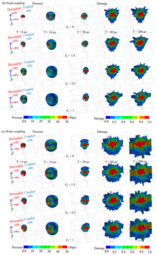 Explosion pressure and damage extension in EDC blasting under different decoupling ratios: (a) air coupling; (b) sand coupling; (c) water coupling.