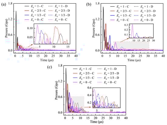 Pressure–time curves for rock units under EDC blasting with different decoupling ratios: (a) air coupling; (b) sand coupling; (c) water coupling. C represents the coupled side, and D represents the decoupled side.