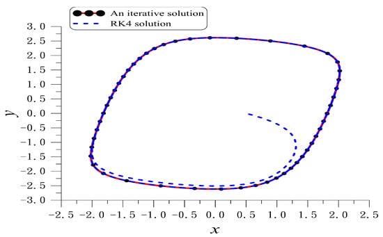 By using the iteration method we obtain and . Figure 5 plots the periodic orbit with the absolute error of periodicity conditions. The RK4 solution is starting from and , and it fast tends to the limit cycle with the maximum value of x to be .