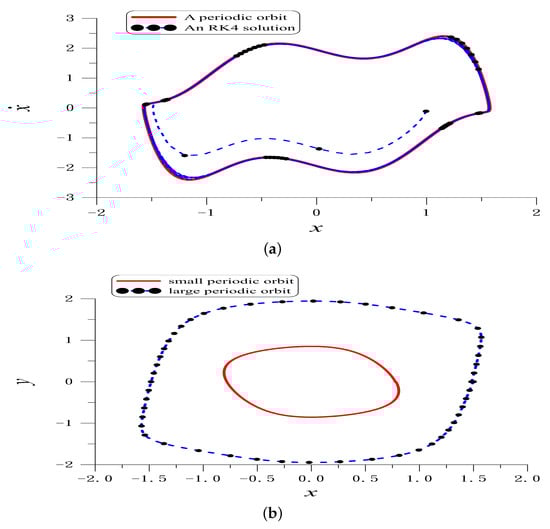 Figure 4b plots two periodic orbits with and for larger one, and and for smaller one.