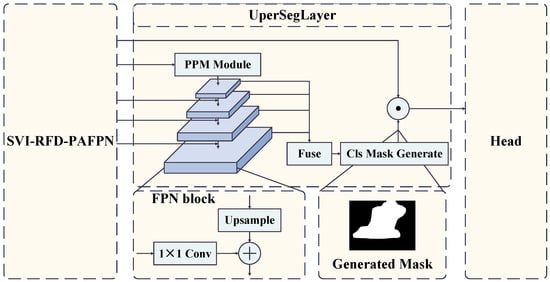 To achieve this, we adapt the classical UPerNet semantic segmentation architecture [4] and construct a lightweight segmentation module, termed the UperSegLayer. This module is integrated into SDDNet to extract forging regions from FDMPI images. Different from conventional semantic segmentation, UperSegLayer is used as an auxiliary module for background modeling to guide feature refinement for defect detection. Its backbone and neck operate independently of the detection head, and the overall structure is shown in Figure 3.