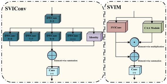 The SVIConv adopts an inception-style structure composed of a small-kernel convolution branch for local feature extraction and a set of parallel depth-wise convolutions (DWConv) for capturing contextual information at multiple scales. A schematic illustration of the SVIConv and the overall SVIM structure is provided in Figure 4. Specifically, for SVIM at stage l, given an input feature map , the SVIConv can be formulated as: