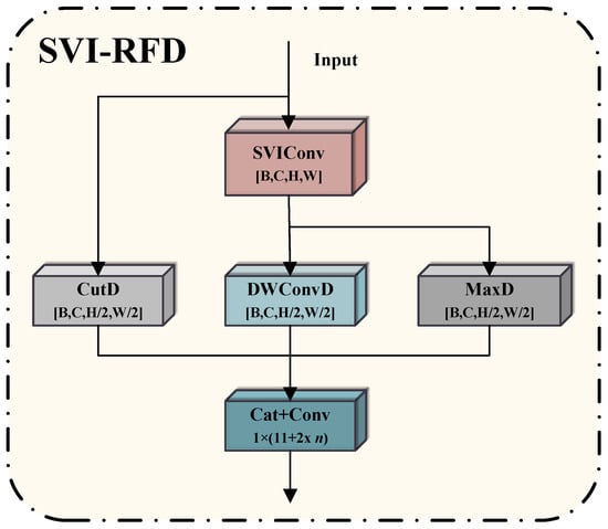 To further address the multi-scale feature extraction (MFE) challenges present in FDMPI data, we integrate the SVIM concept with RFD and develop the SVI-RFD module, which enhances both MFE capability and feature robustness during downsampling, as shown in Figure 6. Specifically, SVI-RFD follows the core design philosophy of RFD by first preserving the original feature-map information through cut downsampling (CutD) while simultaneously enriching multi-scale representations via the SVIConv. For the feature maps processed by SVIConv, SVI-RFD subsequently applies depth-wise convolution downsampling (DWConvD) to capture and fuse local feature cues. Finally, Max Pooling downsampling (MaxD) is performed to prevent the loss of key structural details, particularly those associated with small or slender defect regions. Through this combination of CutD, SVIConv-based enhancement, DWConvD fusion, and MaxD preservation, the SVI-RFD module effectively strengthens cross-scale feature robustness, improves the representation of asymmetric crack patterns, and maintains the stability of symmetric background textures.