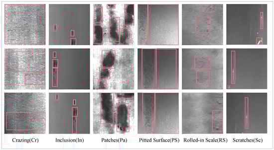 The NEU-DET dataset, established by Song et al. [34], consists of 1800 images containing six types of defects: Cracks (Cr), Inclusions (In), Patches (Pa), Pitted Surface (PS), Rolled-in Scale (RS), and Scratches (Sc). The dataset has been widely used in surface defect detection tasks, and we utilize it to demonstrate the generalizability of our proposed SDDNet method. Some example images from the NEU-DET dataset are shown in Figure 8.