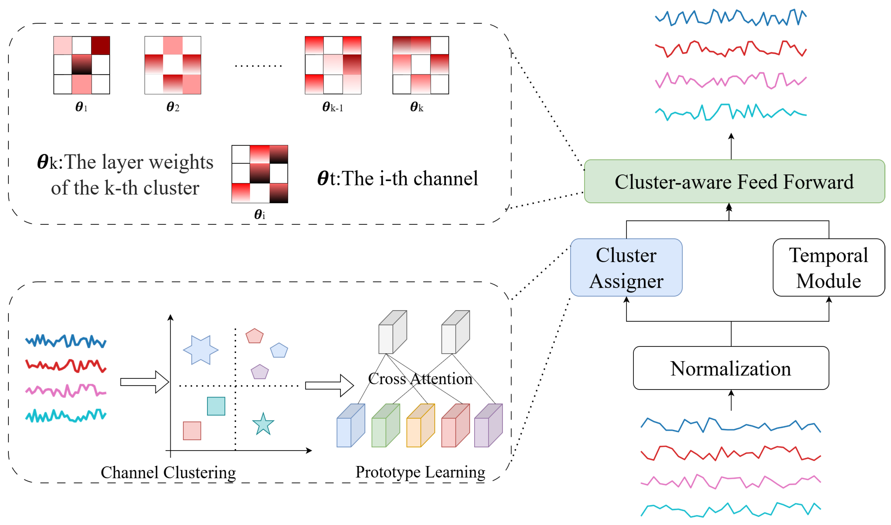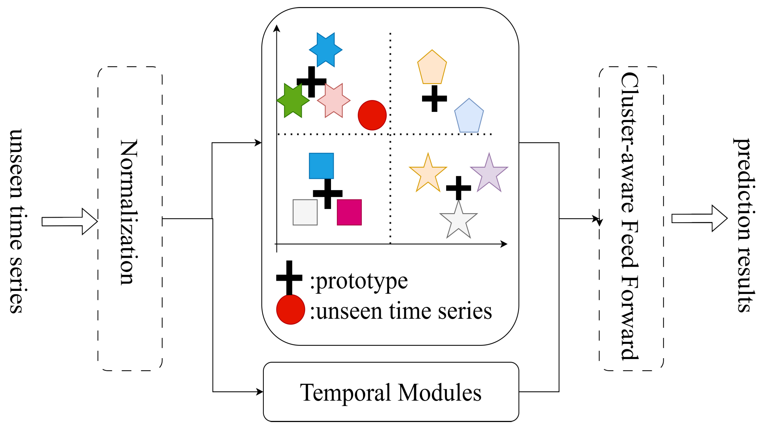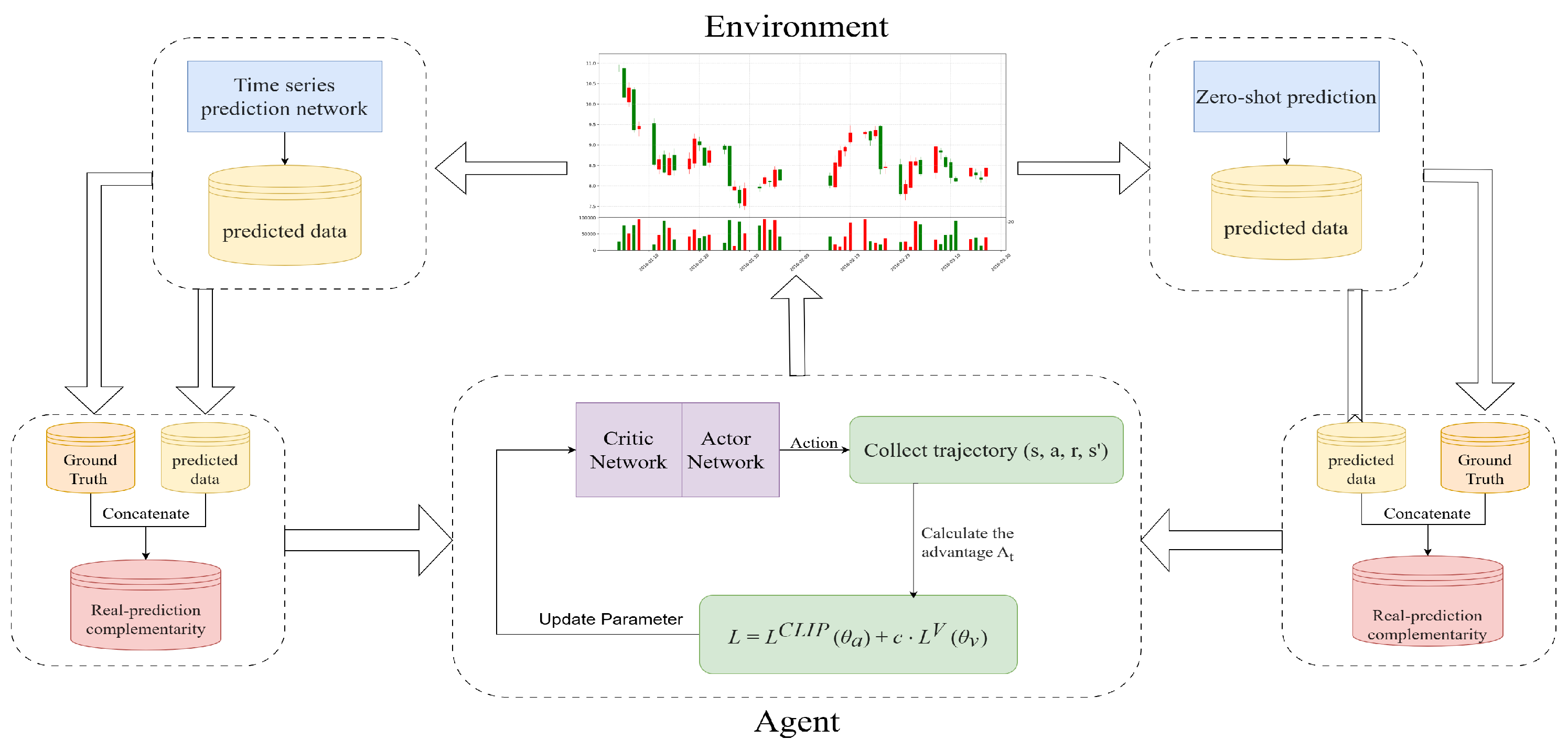 - We propose a DRL framework for stock indices that integrates a time series prediction network with the CE to forecast future financial price data, significantly enhancing prediction accuracy. Meanwhile, during the training phase, CE learns and distills generalized prototype embeddings from the training data when confronted with entirely new, unseen time series or environments, which eliminates the need for additional labeled data or retraining. Instead, by calculating the matching probability between new samples and known clusters based on pre-trained prototype embeddings, it enables knowledge transfer through a cluster-aware feed-forward mechanism, thereby rapidly generating accurate predictions.