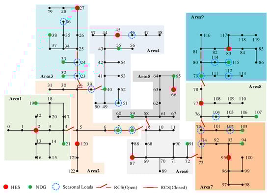 Usually, the flexible partitioning of a sub-microgrid requires several critical distribution facilities and resources for supporting regional autonomous operations. (1) Remote-controlled Switches (RCSs): In the distribution network, the line switches or sectioned switches could be reformed by intelligent mechanical devices and remote communication system for smart functionality [8]. With the seamless switching mode, the state of RCSs can be flexibly adjusted based on operational scenarios, enabling the system to dynamically expand or shrink the boundaries of sub-microgrids. (2) Controllable distributed generations (CDGs): These CDGs are composed of flexible resources, such as energy storage systems, distributed generations with the grid-forming converter or controllable loads. Different from non-controllable distributed generations (NDGs), these resources can serve as the primary power source of each sub-microgrid to provide the voltage and frequency support. By coordinately utilizing RCSs and CDGs, the boundaries and node outputs of sub-microgrid could be flexibly adjusted according to the operational requirements. This collaboration provides enhanced flexibility compared with strategies that only consider the dynamic performance of CDGs, which fosters the emergence of “flexible microgrids” (FMGs) [9,10,11,12].