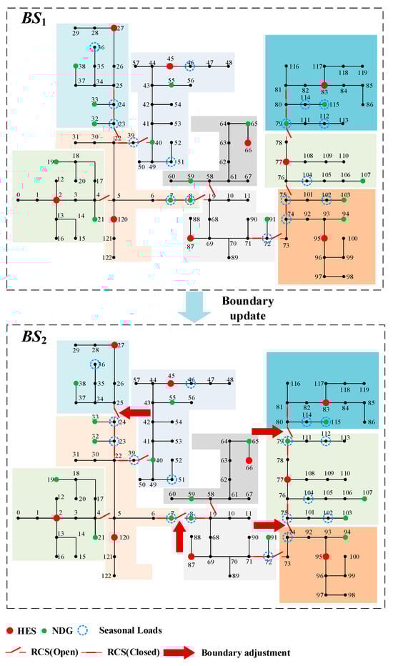 - Continuously changing scenarios pose challenges for optimal operational objectives, the operators should update the boundary and resource operational strategies at different time periods [18]. The resources could form the fixed hour-level or minute-level time intervals to respond to system requirements. However, the frequency of boundary updates must be limited, as the types and lifespans of RCSs such as tie switches or sectionalizing switches do not permit updates with the same intervals as resource updates. Exceedingly short time intervals of boundary adjustments may significantly reduce switch lifespan, while overly long intervals pose challenges for capturing the system’s dynamics [19].