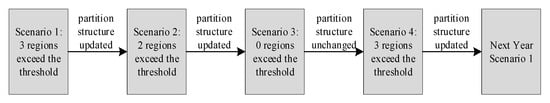 - At the end of each scenario, the composite partition-updating index for all regions can be calculated. If in all regions is less than or equal to the threshold , the partition configuration remains unchanged, . If any region has greater than the threshold, the partition configuration is updated, .