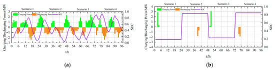 - STES is used for continuous, real-time regulation within a single day, where charging and discharging behaviors occur at each time interval within the scenario, and the charging/discharging power fluctuates frequently. LTES, on the other hand, is used for long-term inter-day energy compensation, typically undergoing only one charge or discharge process within a single scenario. This actual operational logic is consistent with the theoretical strategy illustrated in Figure 4 and Figure 5.