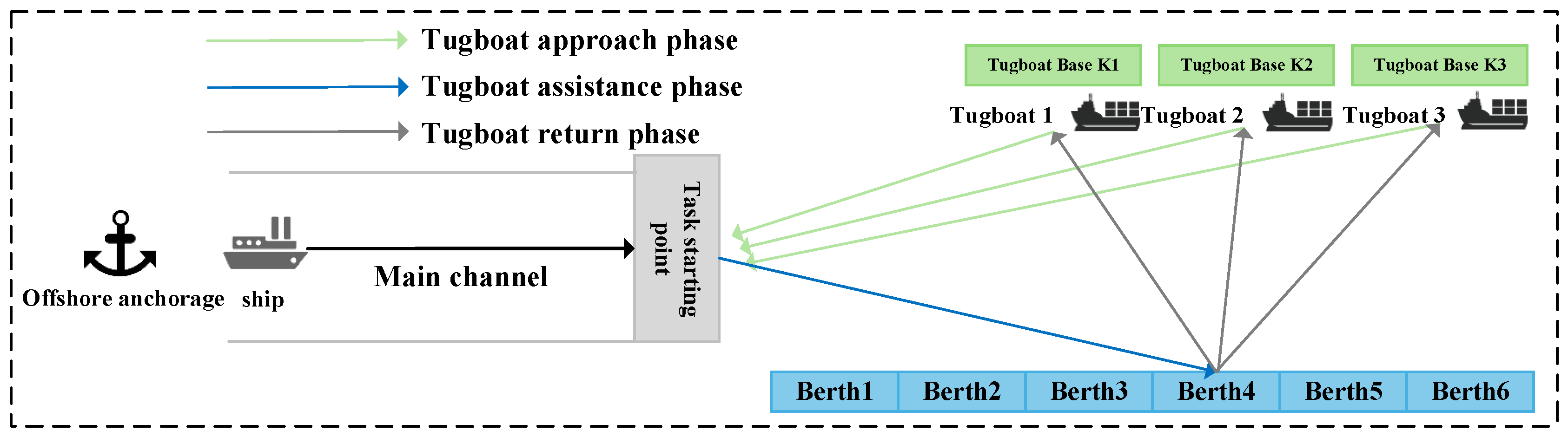 Figure 1. When a vessel arrives at the anchorage area and idle tugboats are available, the assigned tugboat initiates its journey toward the anchorage. The tugboat then provides berthing assistance, supporting the vessel until it is safely moored at the target berth. Upon completion of the task, the tugboat returns to its base and awaits the next assignment.