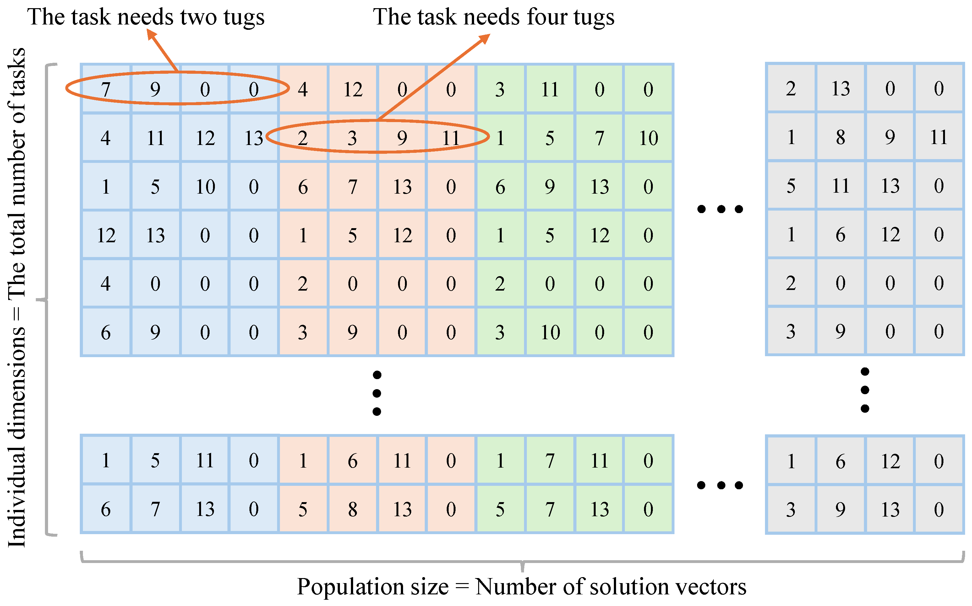 II. Feasible initialization. Each task must be matched with tugboats that satisfy its quantity and power requirements, which constrains tugboat usage. Given the task order and model constraints, we identify the set of currently available tugboats and randomly generate an initial pool of candidate solutions from this set, ensuring that no infeasible assignment arises.