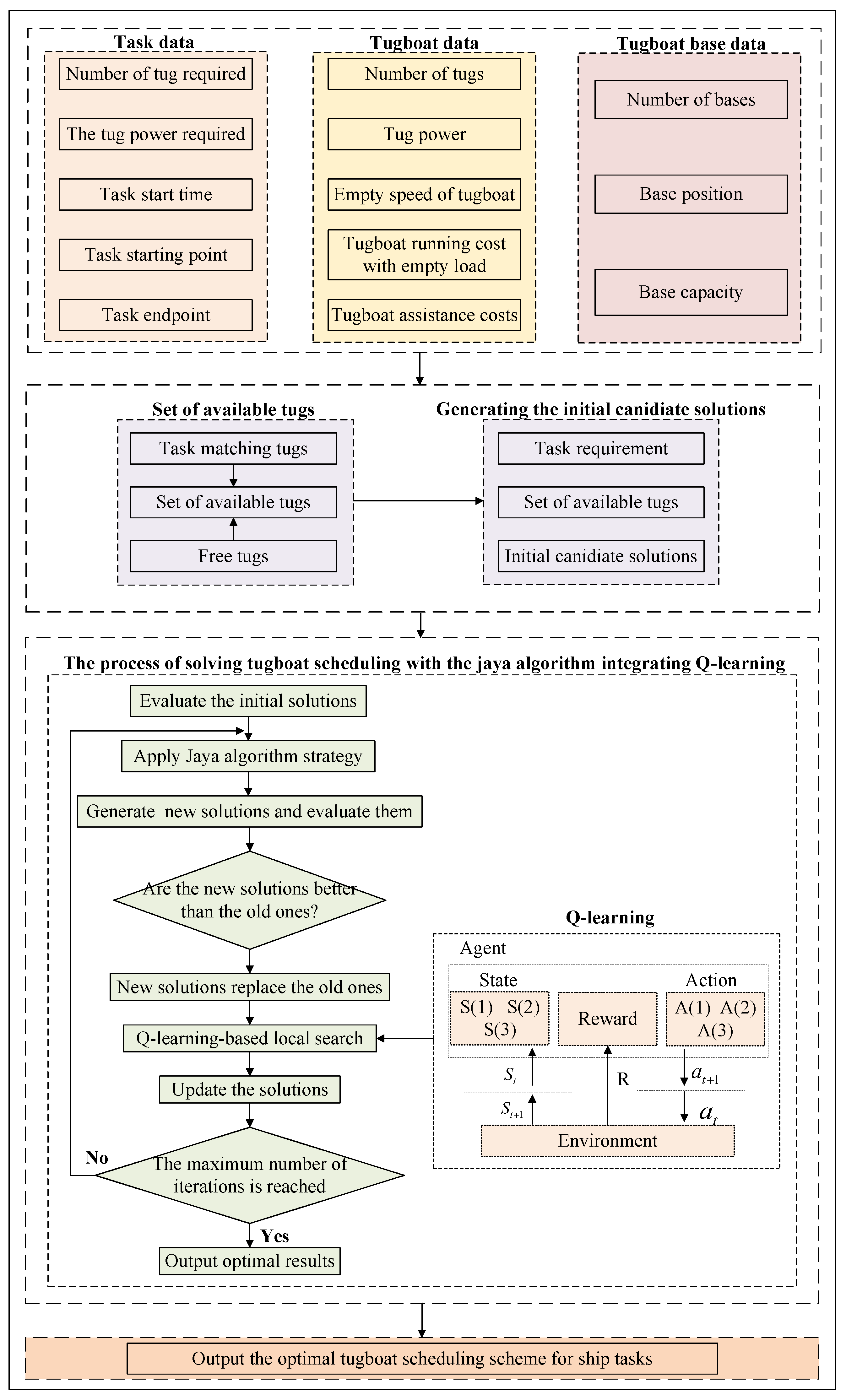 This paper employs a Jaya algorithm integrated with Q-learning to solve the tugboat scheduling model. The detailed computational procedure is illustrated in