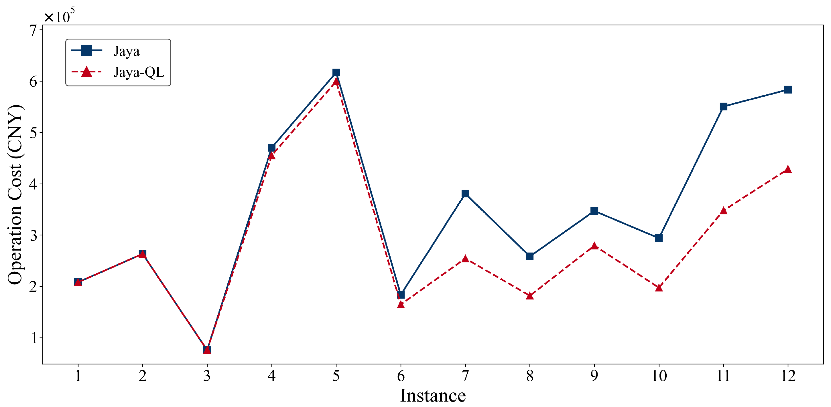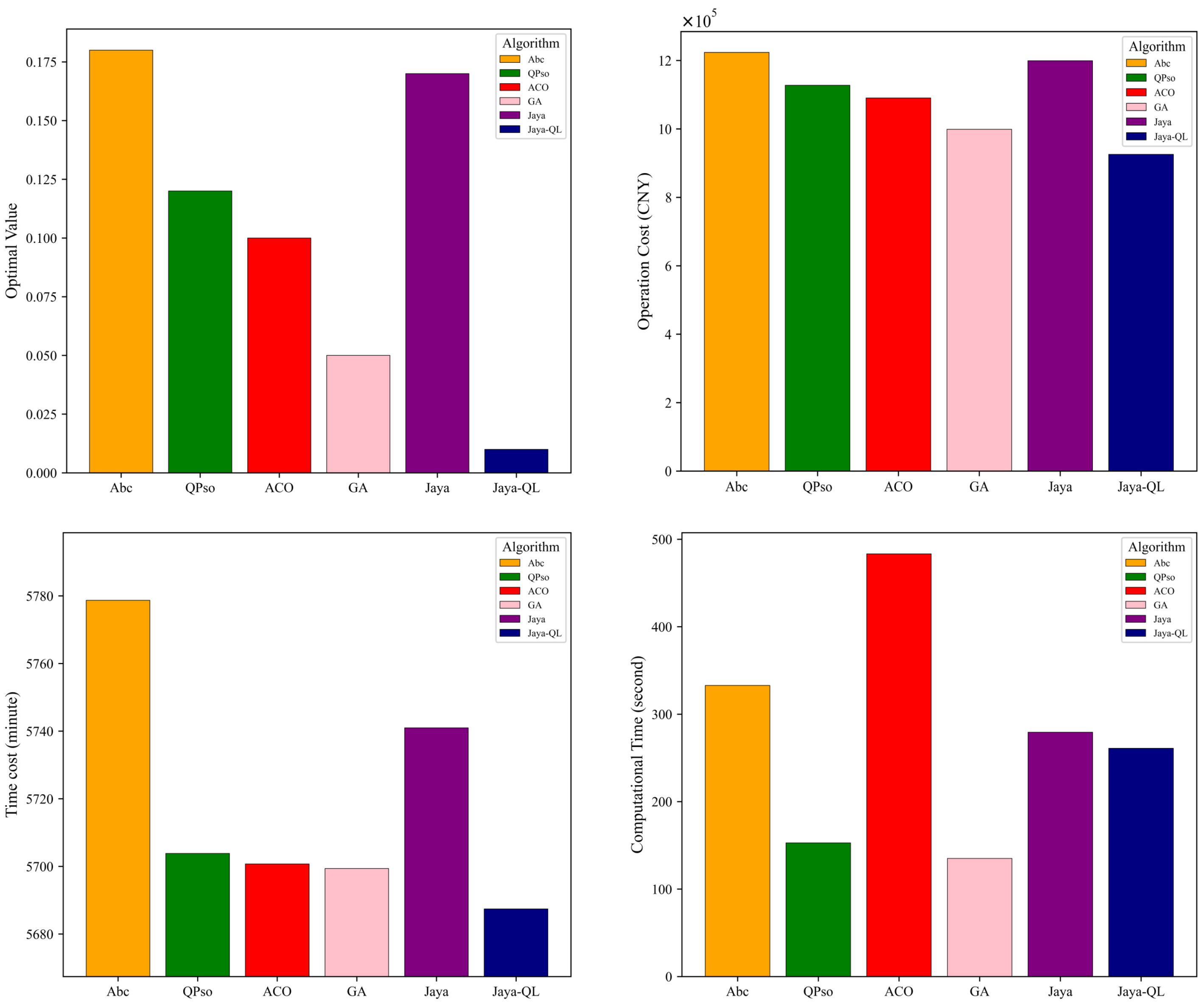 Table 10, the optimal solutions along with their corresponding total operation costs, total operation times, and algorithm computation times are presented for the benchmark algorithms.The proposed Jaya-QL algorithm demonstrates a clear advantage in global optimization compared to the benchmark algorithms. By integrating Q-learning’s dynamic balance between exploration and exploitation, Jaya-QL effectively escapes local optima throughout the iterations. The fitness value of the final solution exhibits a stepwise decline, confirming the effectiveness of reinforcement learning in enhancing solution quality in multi-objective optimization problems. In contrast, the other algorithms tend to exhibit premature convergence during the mid-phase of the search process. In addition to its superior convergence accuracy, Jaya-QL demonstrates remarkable computational reliability. Statistical analysis reveals that the algorithm yielded a standard deviation of 10,750.41 for operational costs, a figure substantially lower than those recorded for ABC (48,232.52) and the standard Jaya algorithm (42,394.28). Furthermore, it maintained a minimal standard deviation of 7.21 in temporal costs. This enhanced stability underscores the efficacy of the integrated Q-learning framework in mitigating sensitivity to stochastic variations. By dynamically regulating the exploration-exploitation trade-off, the proposed mechanism facilitates consistent convergence toward high-quality solutions.