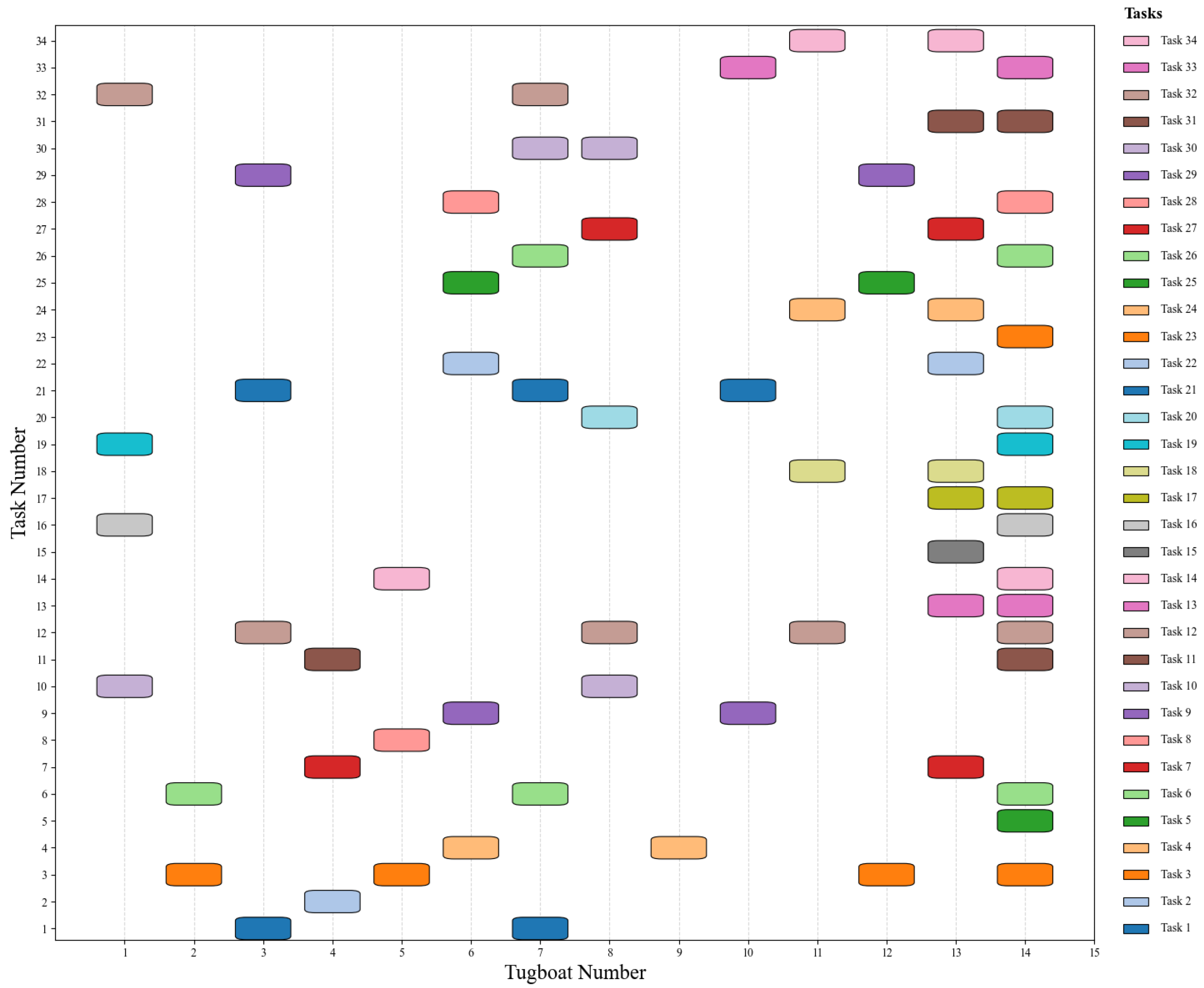 This paper uses the arrival and departure timetable for the main port area of Lianyungang from 12:00 on 14 October 2024 to 12:00 on 16 October 2024 as the case study. During this period, 34 vessels required tug assistance for berthing, unberthing, and shifting. Detailed vessel information is provided in