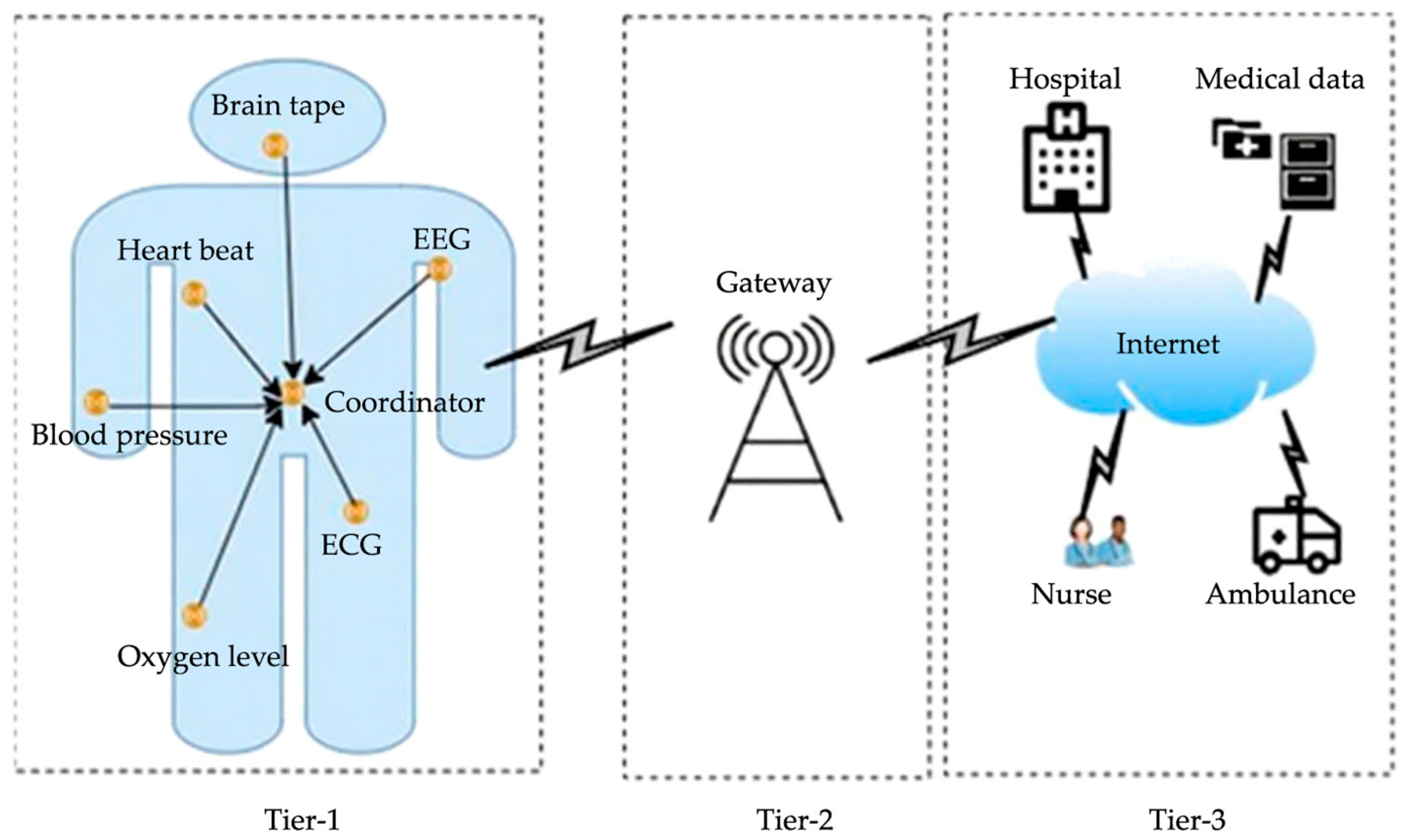 2]. A WBAN consists of a coordinator and multiple miniature, intelligent sensors—either wearable or implantable—that facilitate the real-time sensing and wireless transmission of vital physiological data, such as electrocardiograms (ECGs) and electroencephalograms (EEGs) [