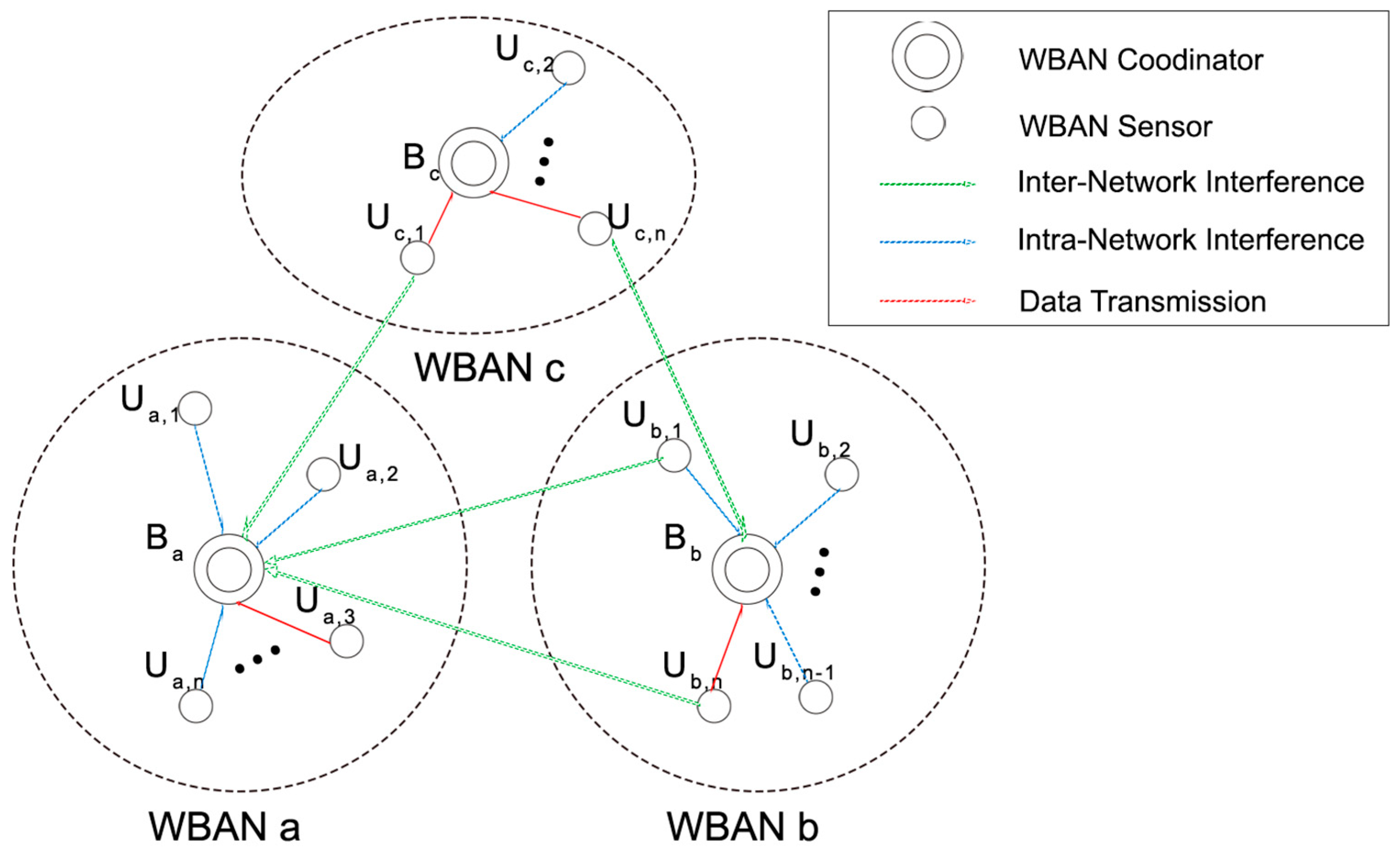 Figure 2, inter-network interference occurs as WBANs become more common and coexist in crowded environments like hospitals, public transportation, and smart homes.