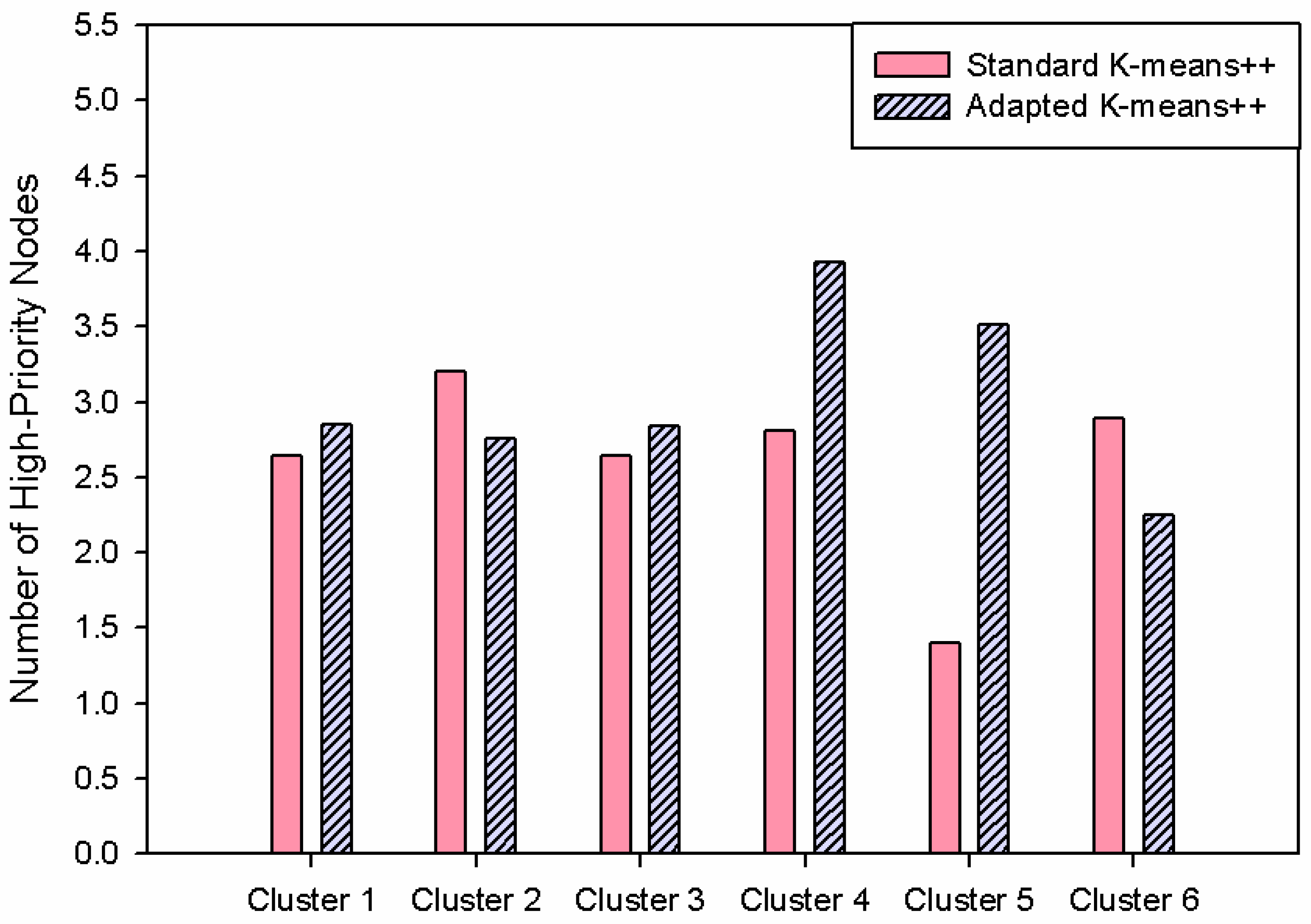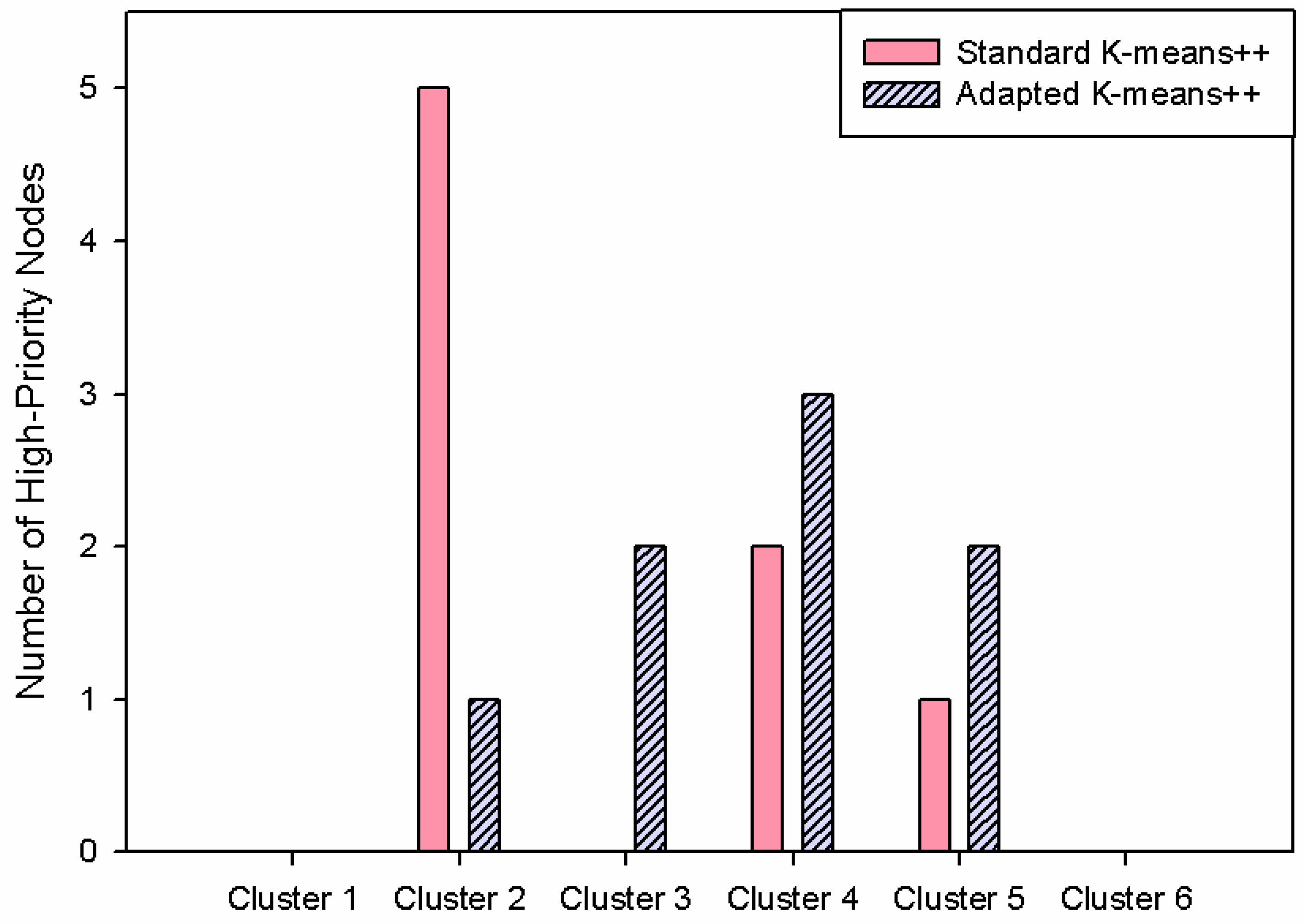 Figure 3, it is observed that Clusters 1 and 6 have no assigned nodes. This occurs because the K-means++ algorithm adaptively initializes centers based on data density. In this specific simulation instance, the spatial and interference distribution of the 30 WBANs naturally converged into four distinct groups. The algorithm effectively pruned the unnecessary clusters, demonstrating its flexibility in handling varying network densities. The standard K-means++ algorithm resulted in a significant concentration of high-priority WBANs, with five such nodes clustered into a single group, leading to severe resource competition. In contrast, our adapted algorithm achieved a significantly more uniform distribution, spreading high-priority nodes across multiple clusters. This visual result is confirmed quantitatively: our adapted algorithm reduced the standard deviation of high-priority nodes per cluster by 65.7% (from 1.37 to 0.47) compared to the standard version, effectively preventing resource bottlenecks.