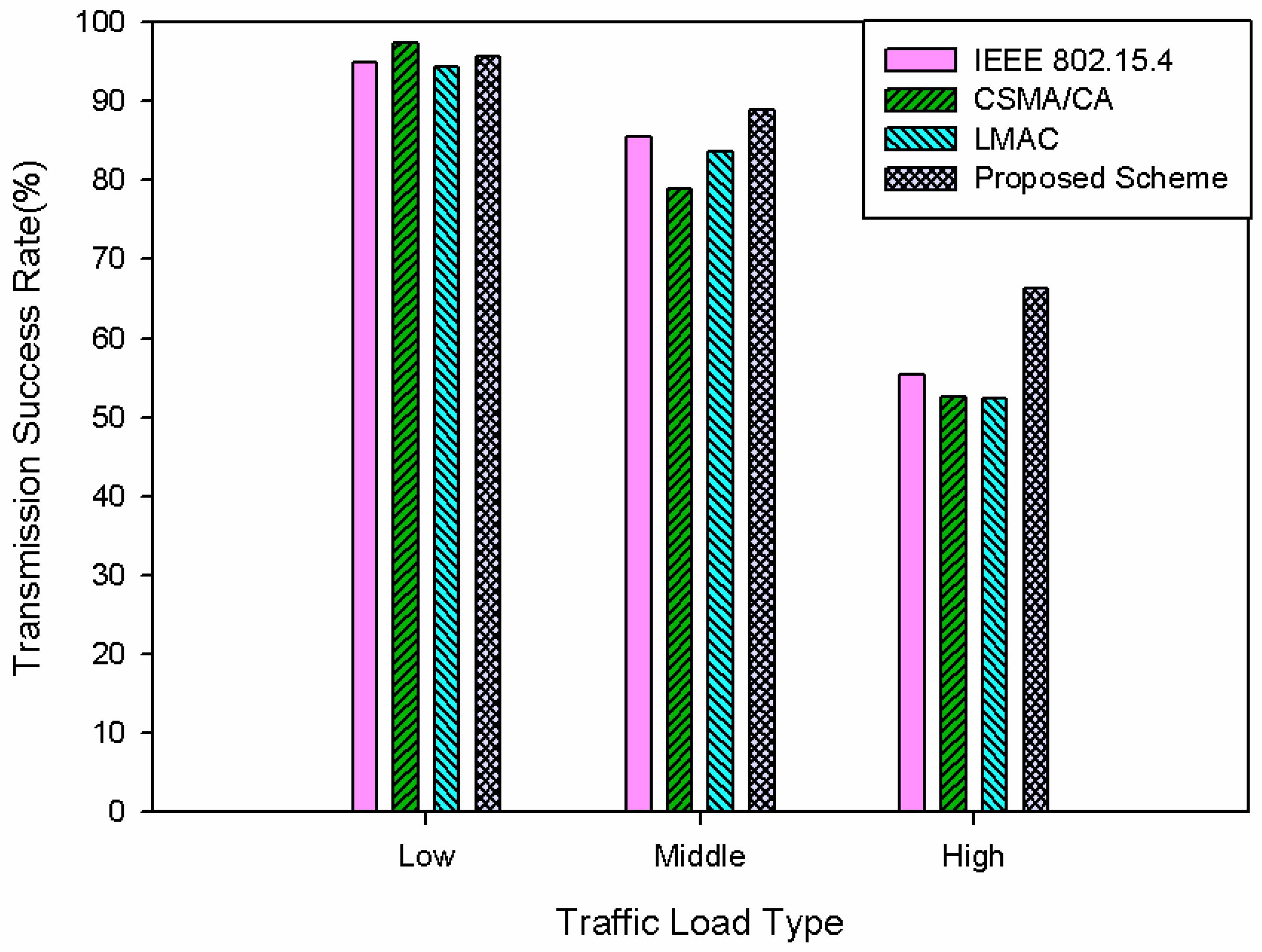 As the load increased to medium, performance began to diverge. The TSR of CSMA/CA dropped sharply due to its contention-based access mechanism, which led to a higher collision rate. IEEE 802.15.4 performed better due to its backoff mechanism. While LMAC also showed a high TSR, its static slot allocation could not adapt to dynamic traffic, leading to inefficient resource use in some slots. In contrast, our proposed strategy exhibited the smallest decline in TSR, demonstrating that its optimized clustering and graph-coloring-based slot allocation effectively prevent data collisions.