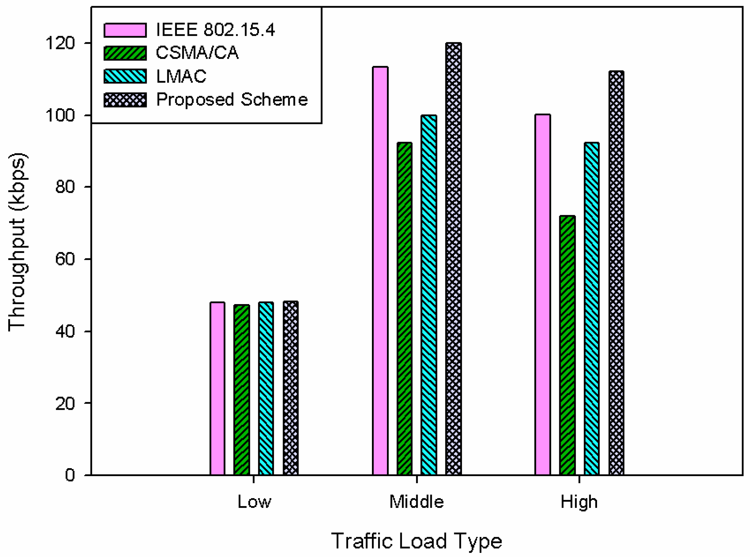 In the high-load scenario, as the channel neared saturation, the throughput of all protocols declined. The drop was most significant for CSMA/CA due to escalating collisions. IEEE 802.15.4’s decline was less severe, and LMAC’s throughput stabilized due to its fixed slots. Our strategy, however, maintained the highest throughput thanks to its flexible and adaptive slot allocation, confirming its robustness in highly congested environments.