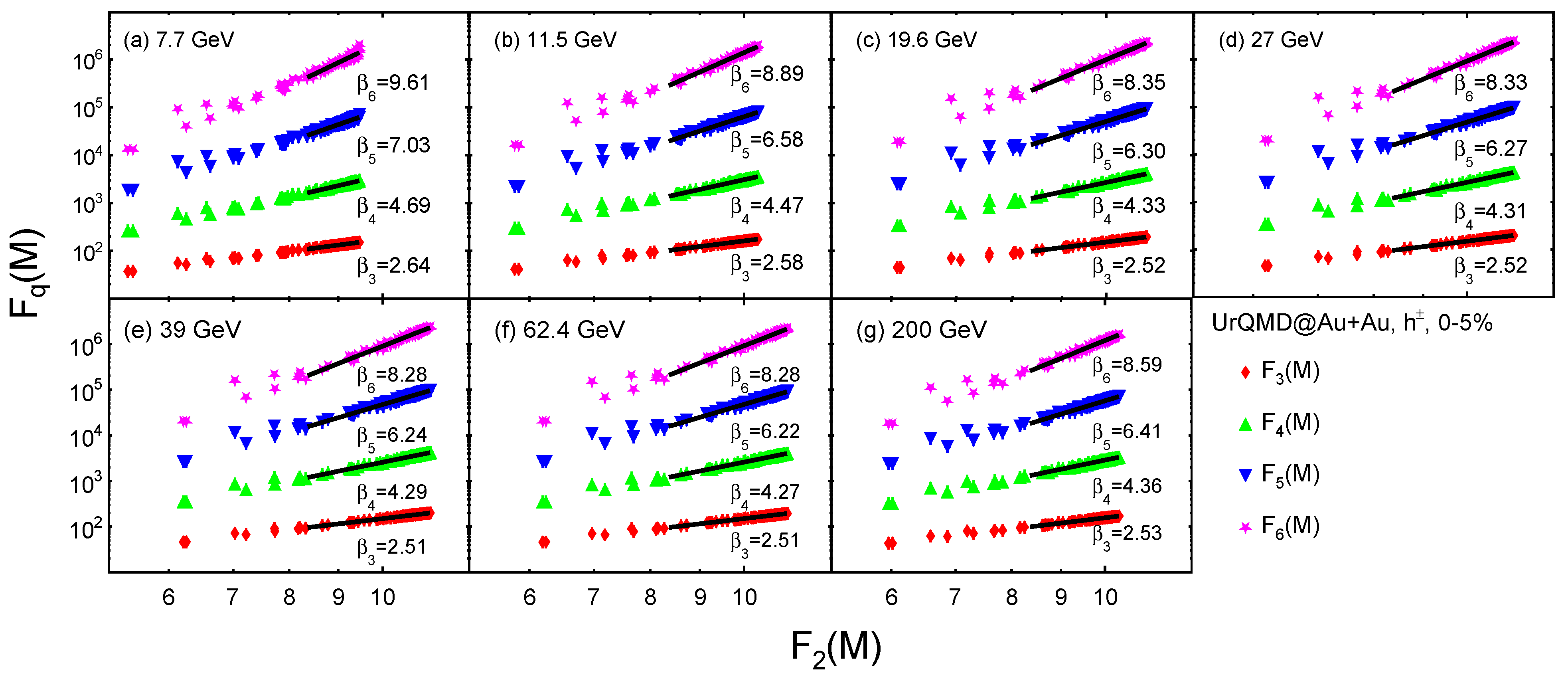25]. A clear power-law scaling of the higher-order SFMs with respect to the second-order SFM was observed at all energies after background subtraction. Moreover, in the most central (0–5%) collisions, a scaling index