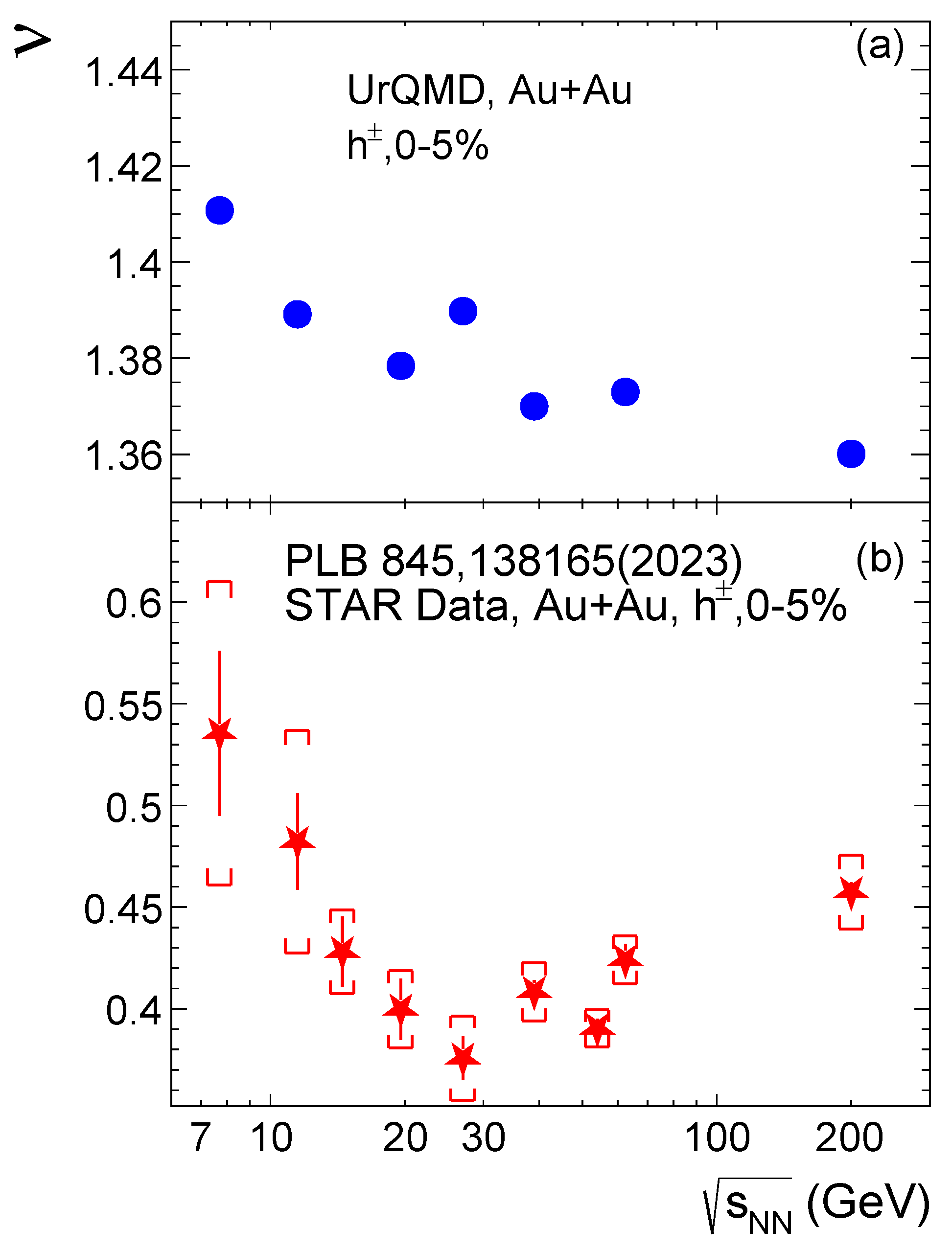 , indicating a weak critical signal superimposed on the UrQMD background. This behavior closely resembles the trend observed in the STAR experimental data. The corresponding