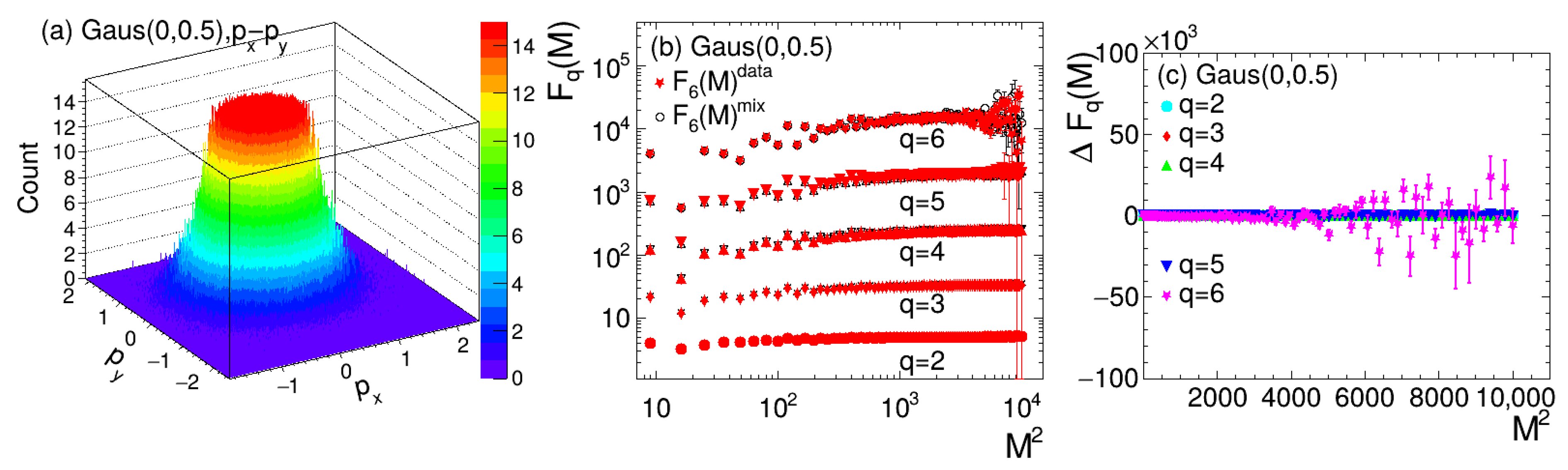 As shown in the previous section, non-critical dynamical fluctuations can contribute to the observed and values. Therefore, a clean baseline that removes all inherent correlations present in the UrQMD data is required. For this purpose, we generate a synthetic data set by sampling particle momenta from a Gaussian distribution. A total of 1 million events are produced. The charged-particle multiplicity per event is sampled from a Poisson distribution with a mean value of , chosen to be close to the measured value of 151 at in the STAR experiment. Within each event, the transverse momenta () of particles are generated as Gaussian random variables with a mean of zero and a variance of . An additional cut of is applied to this Gaussian data set.
