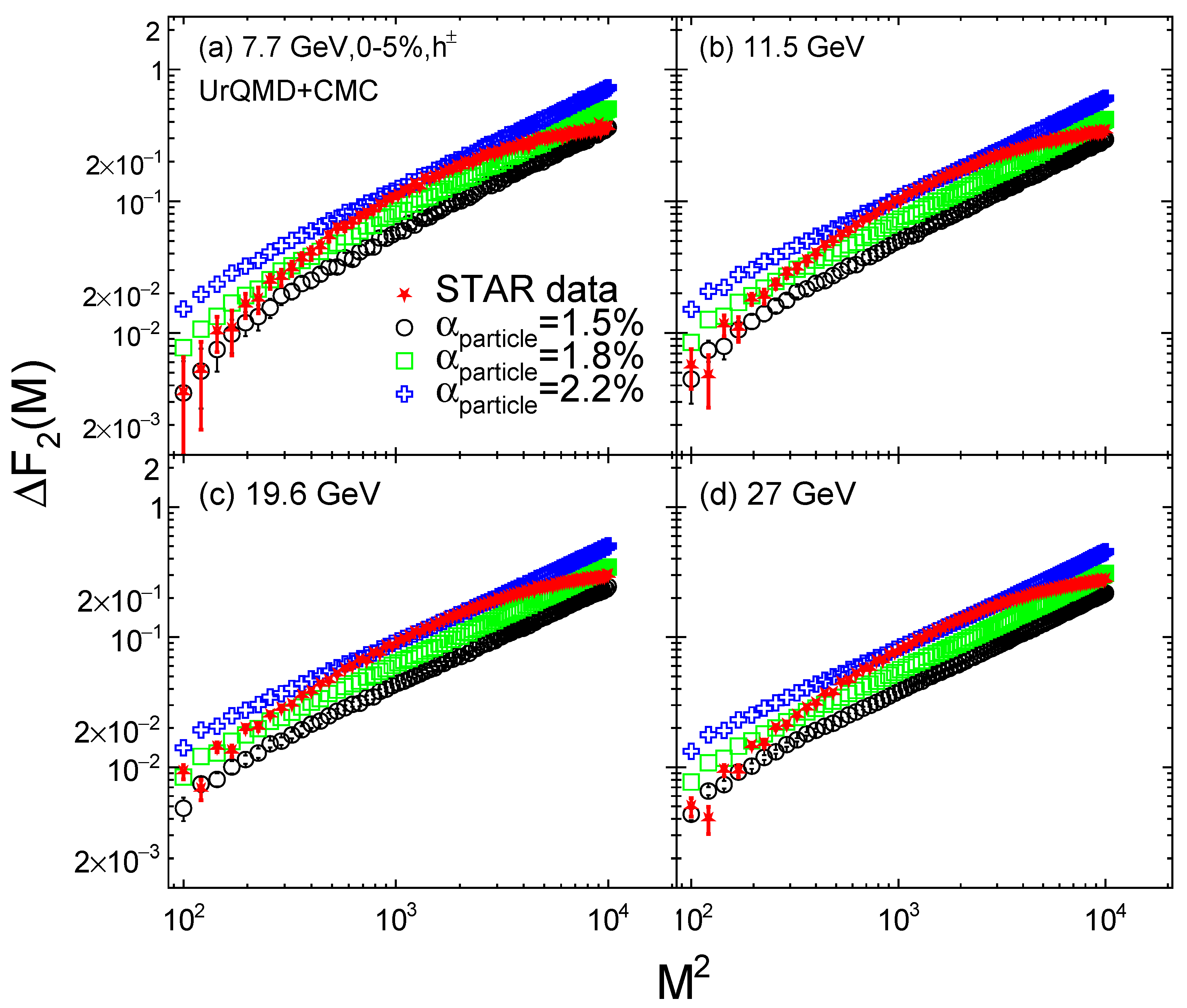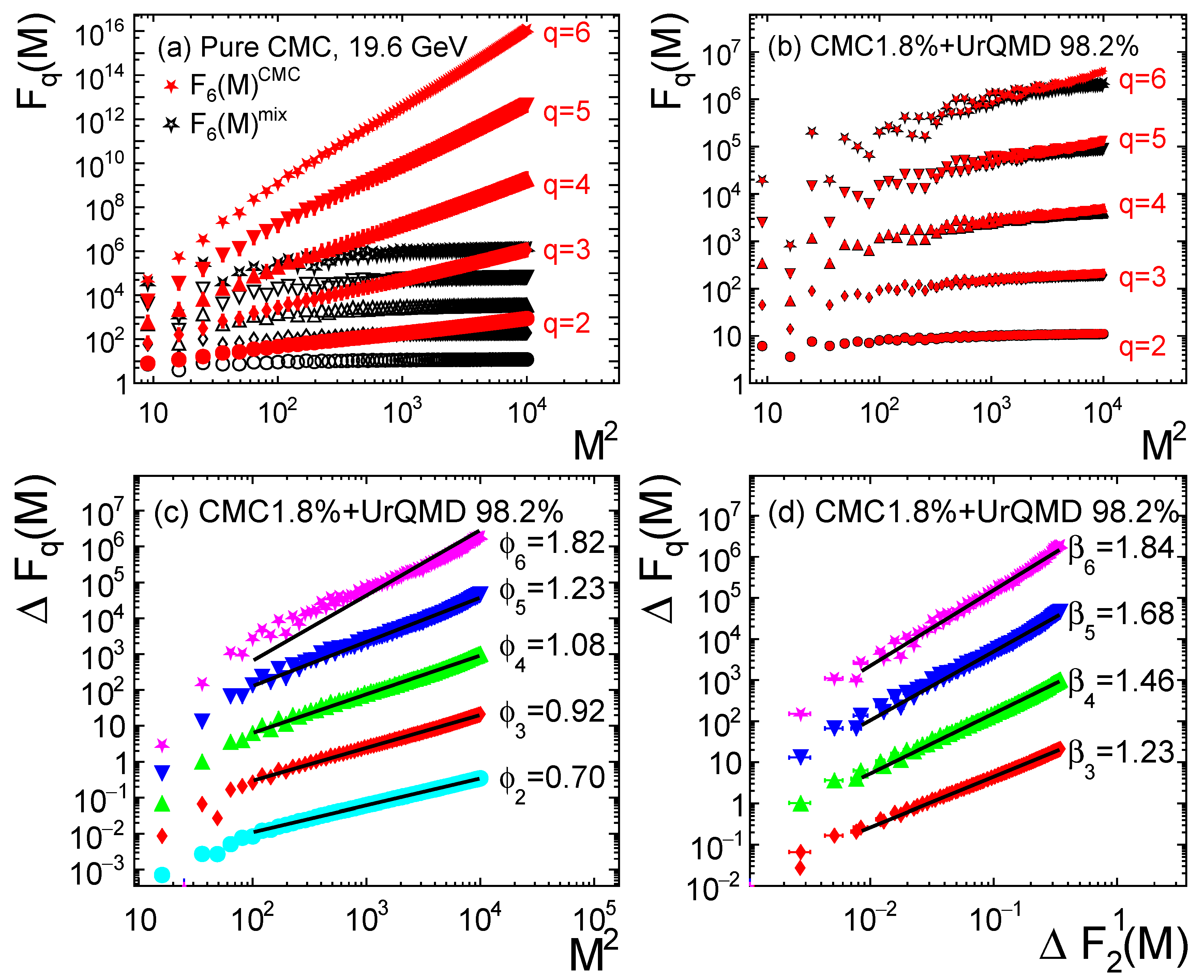 48]. This model generates particle momenta via Lévy random walks, thereby creating localized, critical density fluctuations in momentum space. It should be noted that the CMC is essentially a toy model, designed as a static momentum space generator rather than a dynamical simulation. It only supplies momentum space distributions for final-state particles and does not include any dynamical evolution of the collision system, unlike transport models such as UrQMD which simulate the full heavy-ion collision process including nonequilibrium transport description and hadronic evolution.