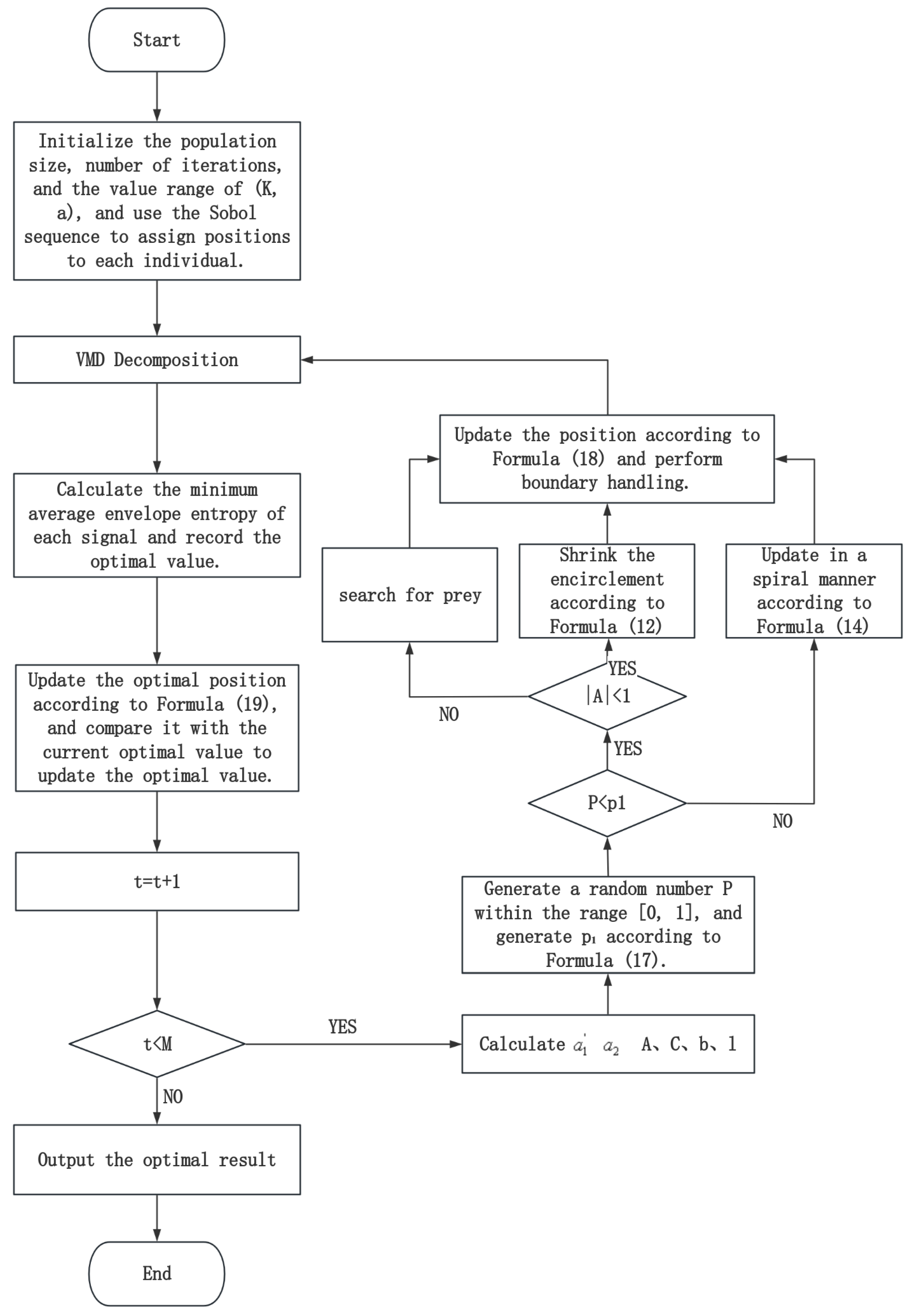 35] improves the WOA with chaotic initialization and Levy flight to optimize VMD parameters for fault diagnosis. Improved initialization strategies, such as the Sobol sequence and chaotic mapping [
