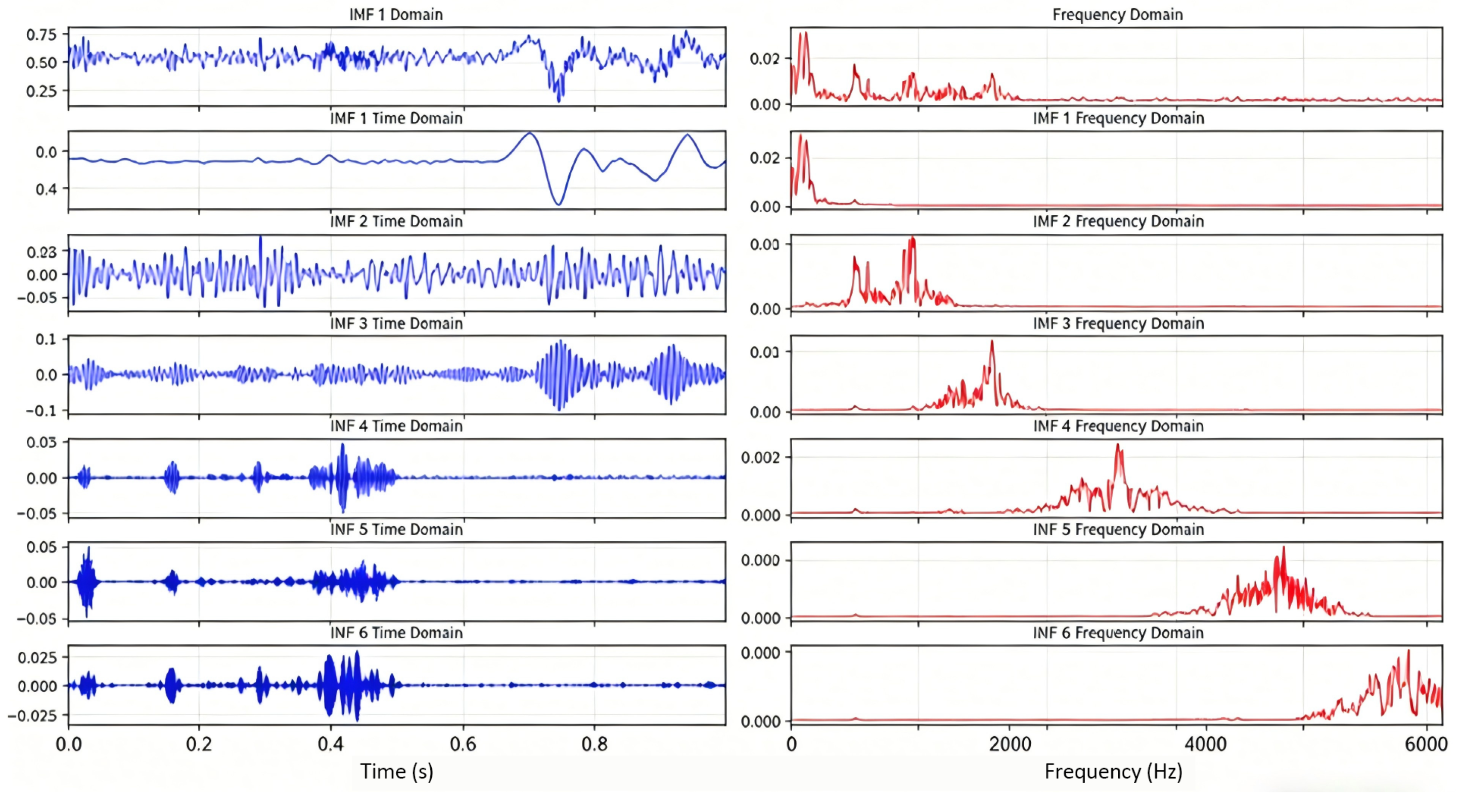 Figure 8), the optimized K = 6 is due to the more complex harmonic components of real-world fault signals. The first four IMFs account for 91% of the total signal energy: IMF-1 matches the theoretical outer ring fault frequency, IMFs 2–4 correspond to fault harmonics, and IMFs 5–6 are low-energy noise components. This indicates that IEWOA-VMD adaptively decomposes the signal into “fault-dominant IMFs” and “noise-dominant IMFs” based on the dataset characteristics.