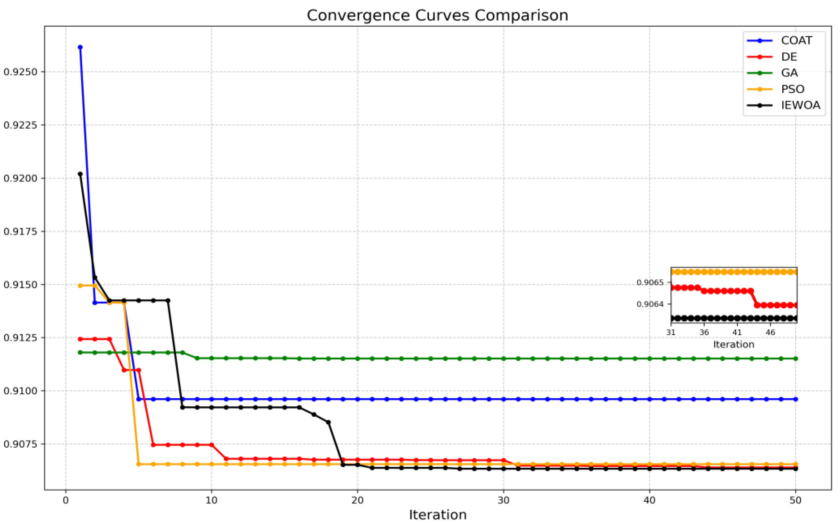 After the IEWOA-VMD decomposition, neither mode mixing nor over-decomposition occurred between the modes of the CWRU and PU datasets. This indicates that the IEWOA achieved global optimization and exhibited robustness. An experimental comparison of VMD decomposition was conducted among the IEWOA, COAT, DE, GA, and PSO algorithms. The iteration curves of these five optimization algorithms are shown in