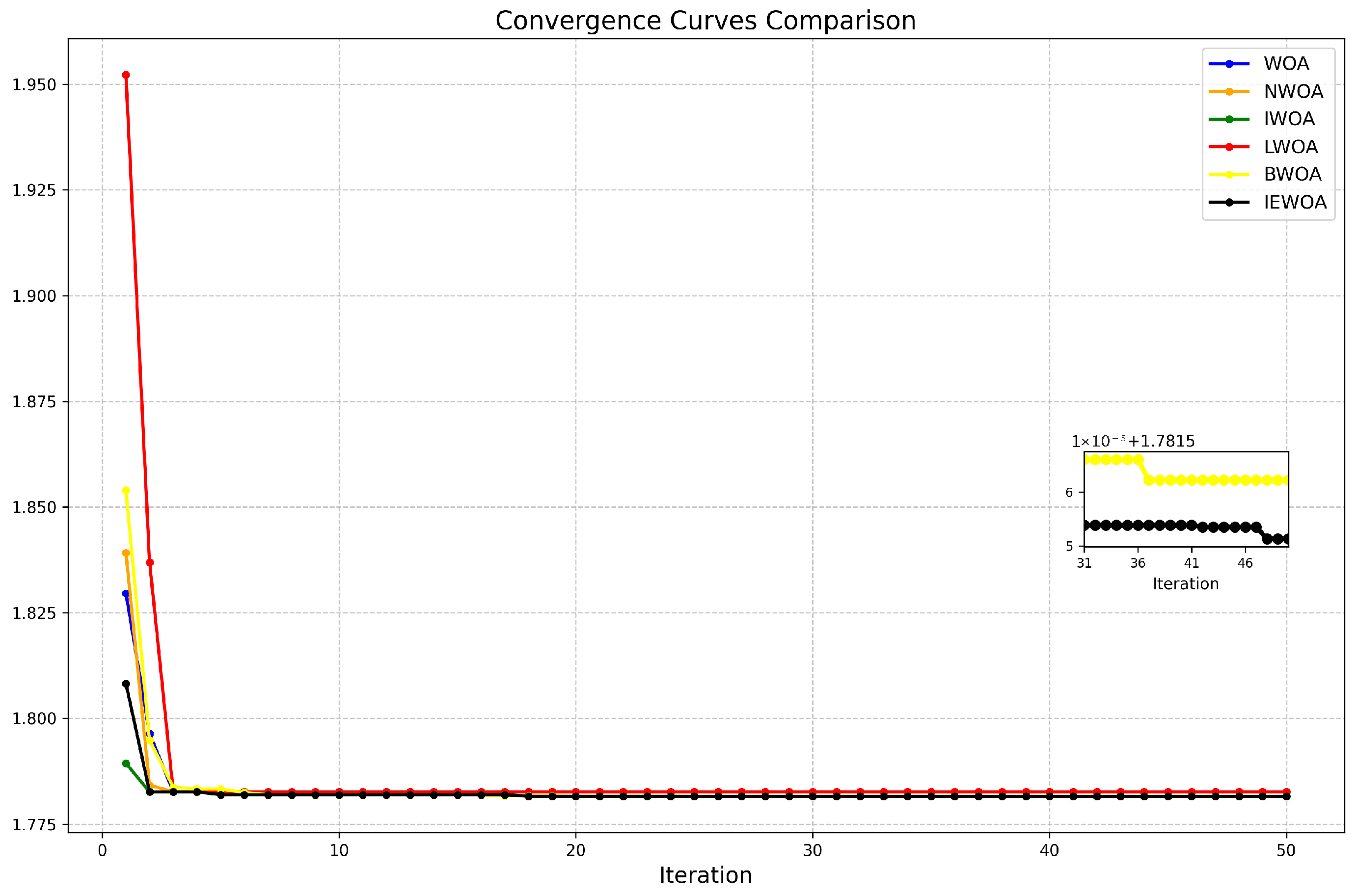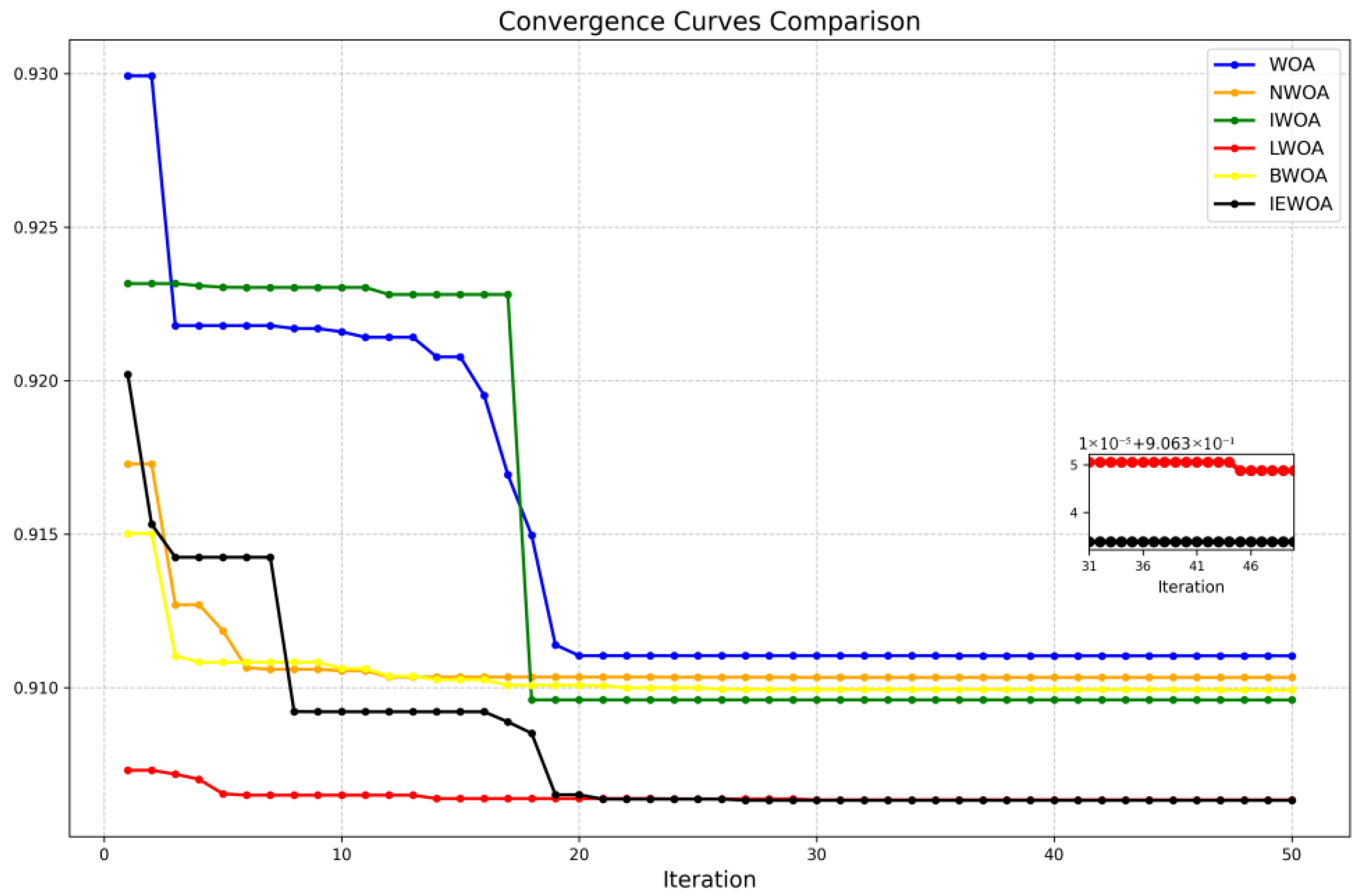 Among the terms cited above, NWOA refers to the WOA integrated with adaptive T-distribution perturbation, IWOA refers to the WOA integrated with differential perturbation, LWOA refers to the WOA integrated with flight strategy, and BWOA refers to the WOA integrated with boundary handling. It can be seen from