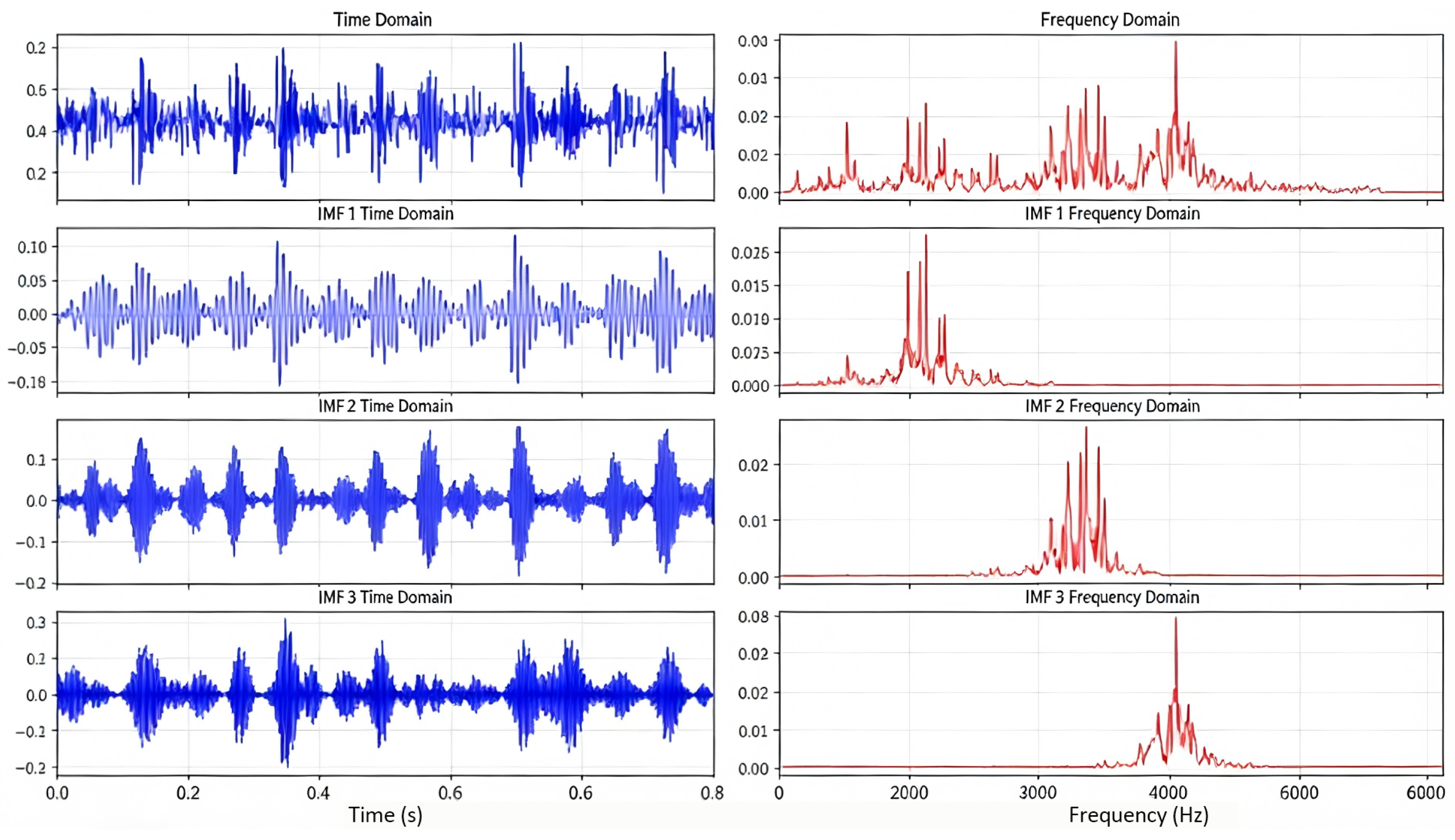 Figure 7, the three decomposed IMFs exhibit distinct frequency characteristics. The center frequencies of the IMFs are non-overlapping, and no energy leakage between components is observed, confirming the absence of mode mixing. For the PU dataset (