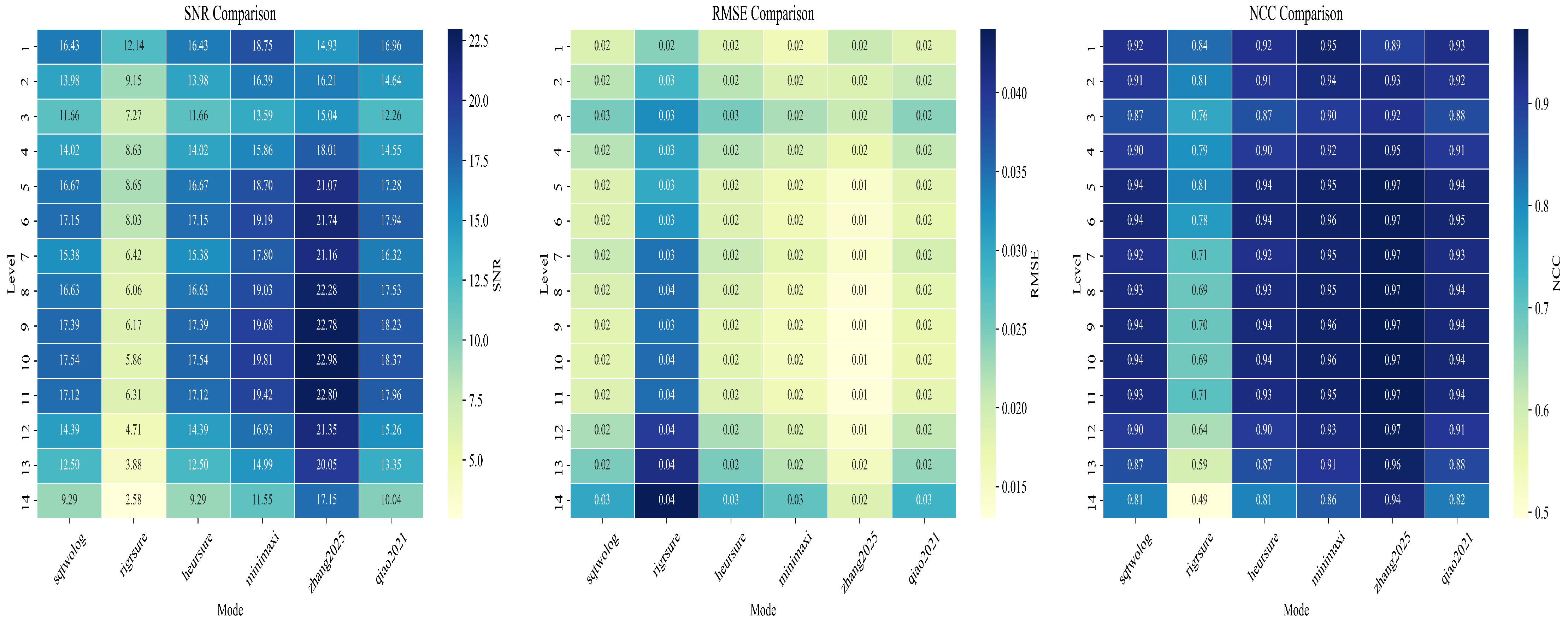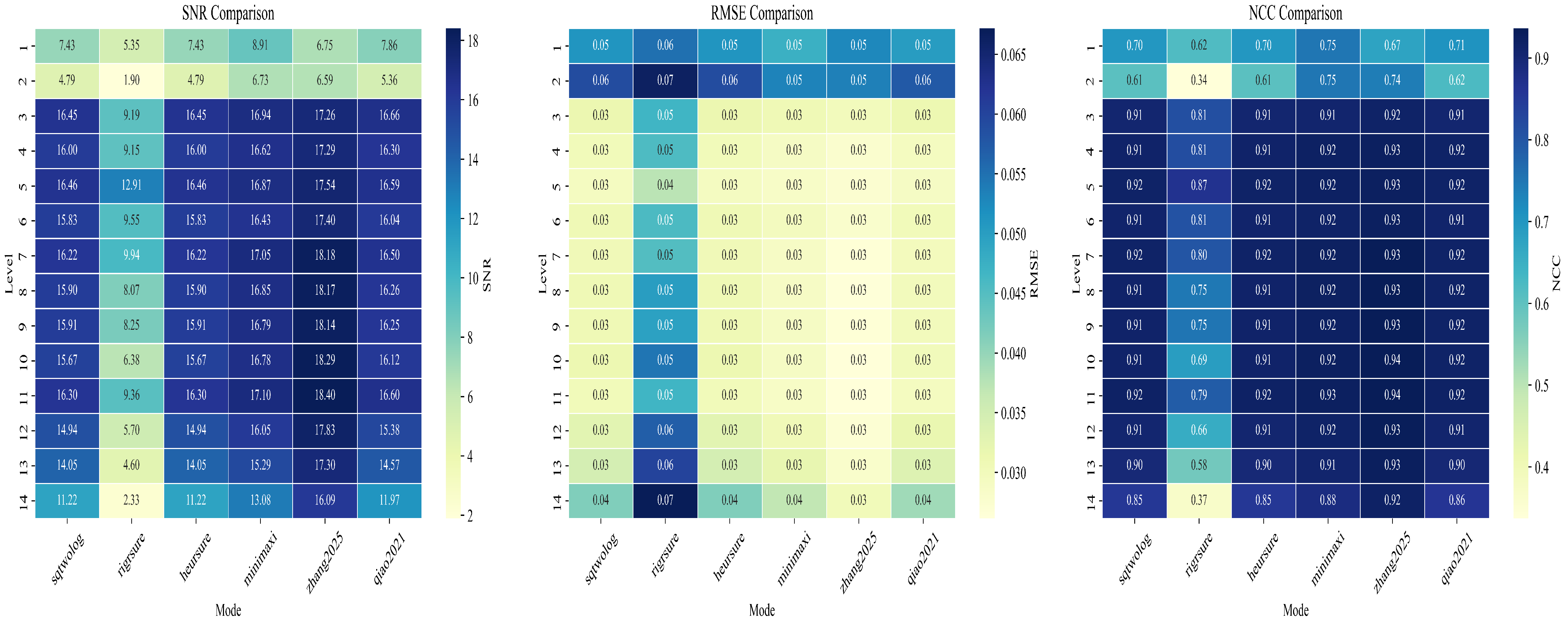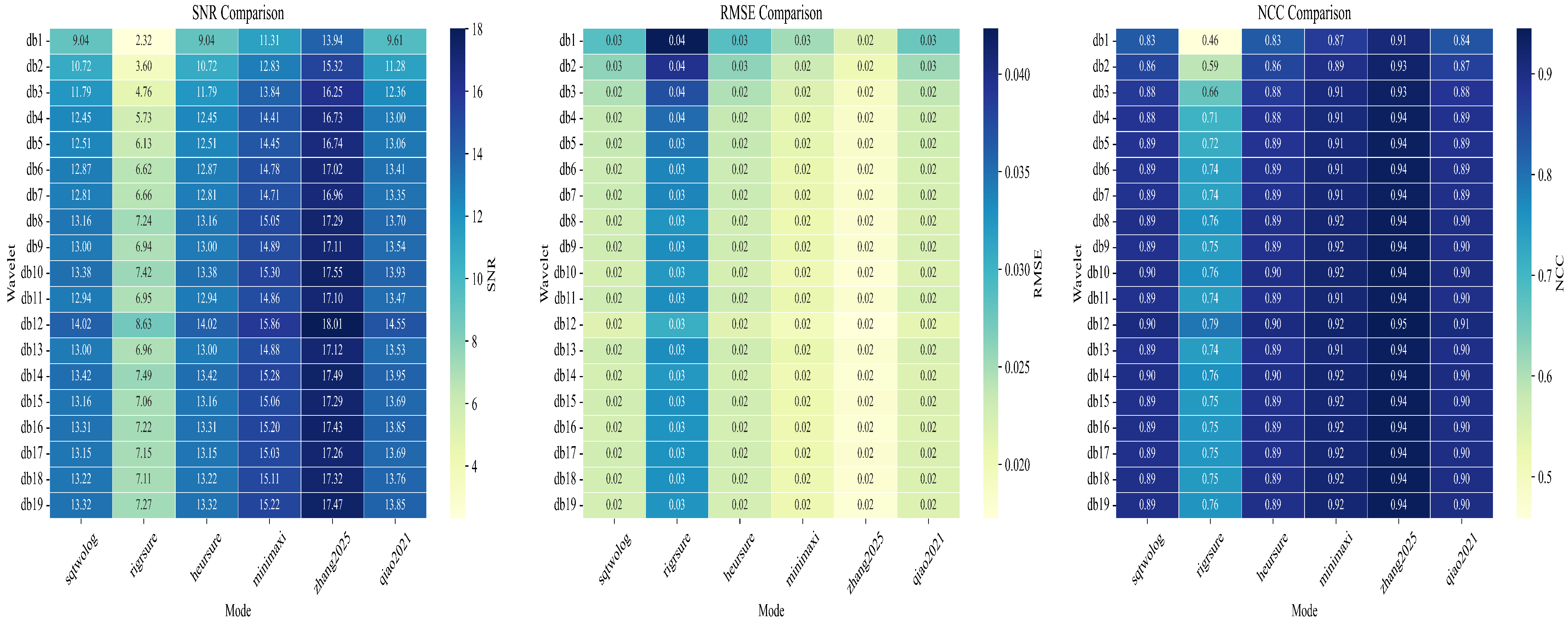 Figure 17. When the Zhang 2025 threshold is applied for denoising, the utilization of ‘db12’ achieves the maximum SNR and the minimum RMSE, and so on.