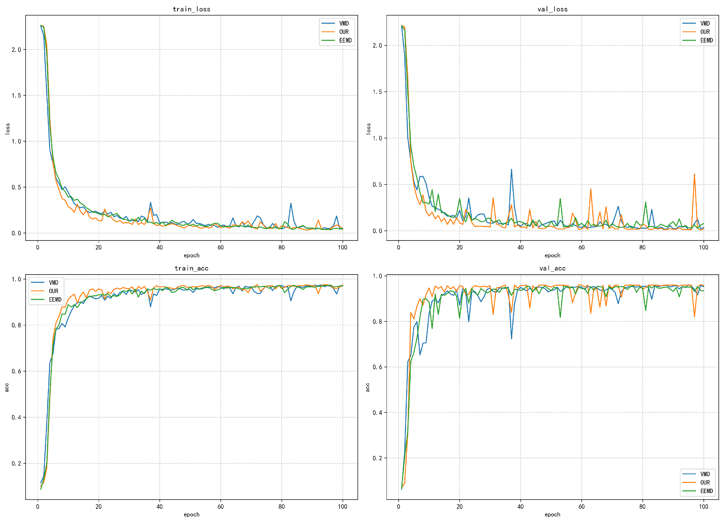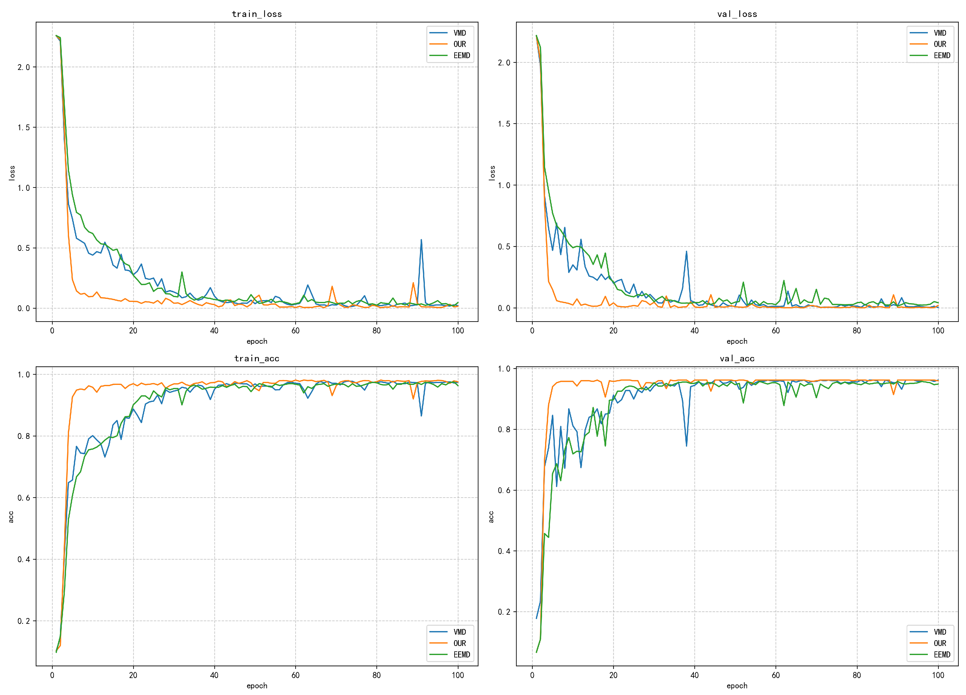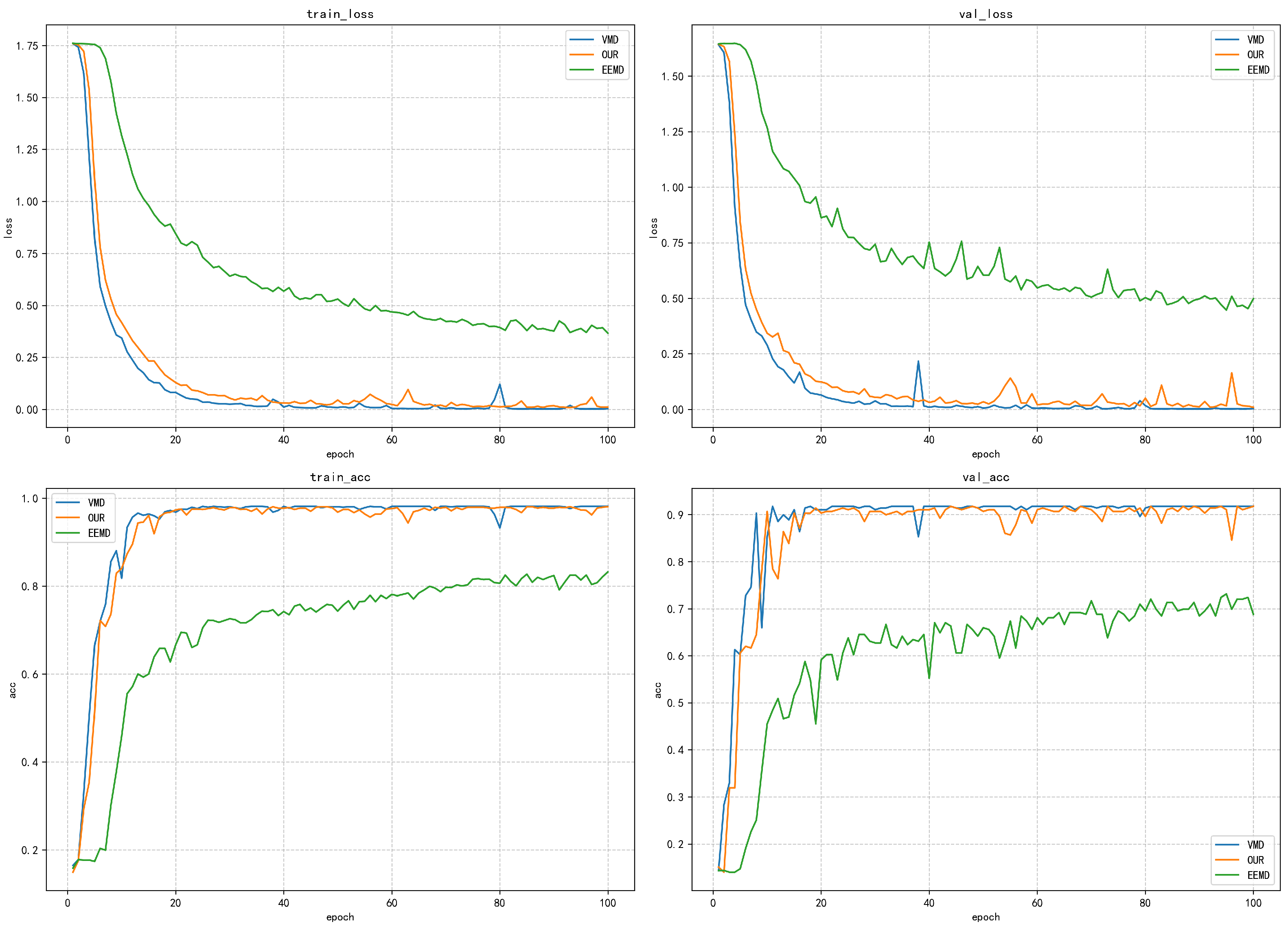 The validation loss curve more significantly reflects the differences between the methods. After 20 iterations, the loss values of the proposed method and VMD have stabilized below 0.5, finally reaching a stable state of approximately 0.25. However, the validation loss of the EEMD method remains above 0.5, and obvious fluctuations occur in the 80–100-iteration interval, indicating that its generalization ability on unseen data is weak. It is noteworthy that the validation loss of all methods is slightly higher than the training loss, but the gap between the proposed method and VMD is controlled within 0.1, demonstrating good generalization ability. In terms of training accuracy, the proposed method and the VMD method show excellent performance: the accuracy exceeds 0.8 within 20 iterations, stabilizes above 0.95 after 40 iterations, and finally approaches the perfect value of 1.0. In contrast, the EEMD method only reaches an accuracy of 0.7 after 60 iterations and finally stabilizes at around 0.8. The validation accuracy curve highlights the differences between the various methods: the proposed method and VMD stabilize above 0.9 after 40 iterations, while the EEMD method only reaches approximately 0.7 in the end, with obvious fluctuations.